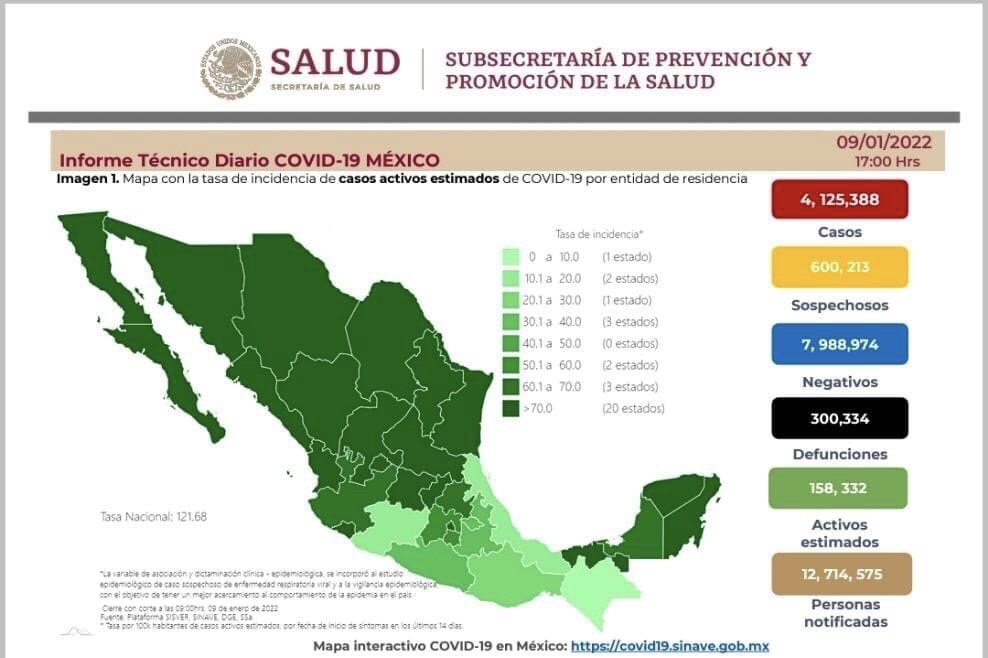 La Secretaría de Salud del Gobierno de México informó este domingo que nuestro país acumula 4 millones 125 mil 388 casos positivos confirmados acumulados y 300 mil 334 defunciones totales por COVID-19.