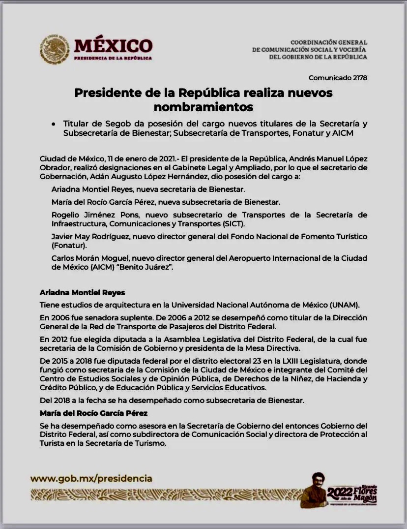 La subsecretaría del Bienestar, entonces ocupada por Montiel, ahora será ocupada por María del Rocío García Pérez.