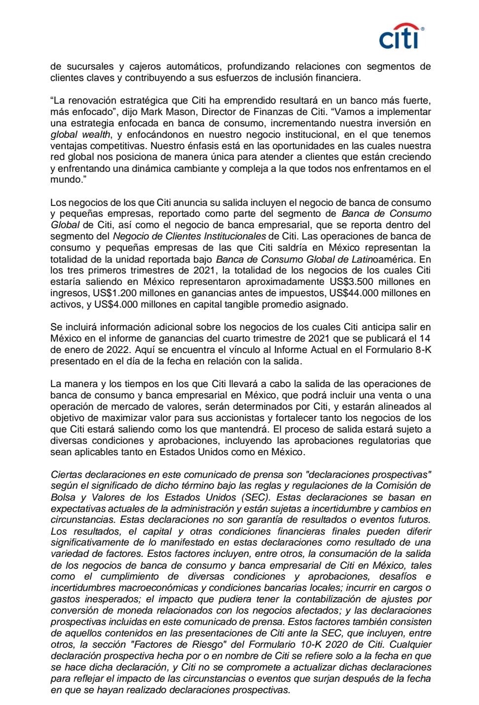 Aquí el Comunicado íntegro que emitió Citi al respecto: