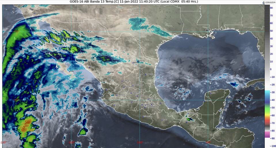 Golfo de México: Cielo medio nublado a nublado con probabilidad de lluvias puntuales muy fuertes en Veracruz (sur), fuertes en Tabasco. Lluvias que podrían generar encharcamientos, deslaves y/o inundaciones en zonas bajas. Además de lluvias aisladas en Tamaulipas. Ambiente frío con bancos de niebla matutinos en zonas serranas de la región y heladas al amanecer en sierras de Tamaulipas y Veracruz. Ambiente templado a cálido por la tarde. Evento de “Norte” con rachas de 80 a 100 km/h en costas de Veracruz, “Norte” con rachas de 60 a 70 km/h en costas de Tamaulipas y “Norte” con rachas de 50 a 60 km/h en costas de Tabasco. Además de oleaje de 3 a 5 metros de altura en costas de Tamaulipas y Veracruz. Probable caída de aguanieve o nieve en cimas montañosas de Veracruz, por arriba de los 4,000 msnm.