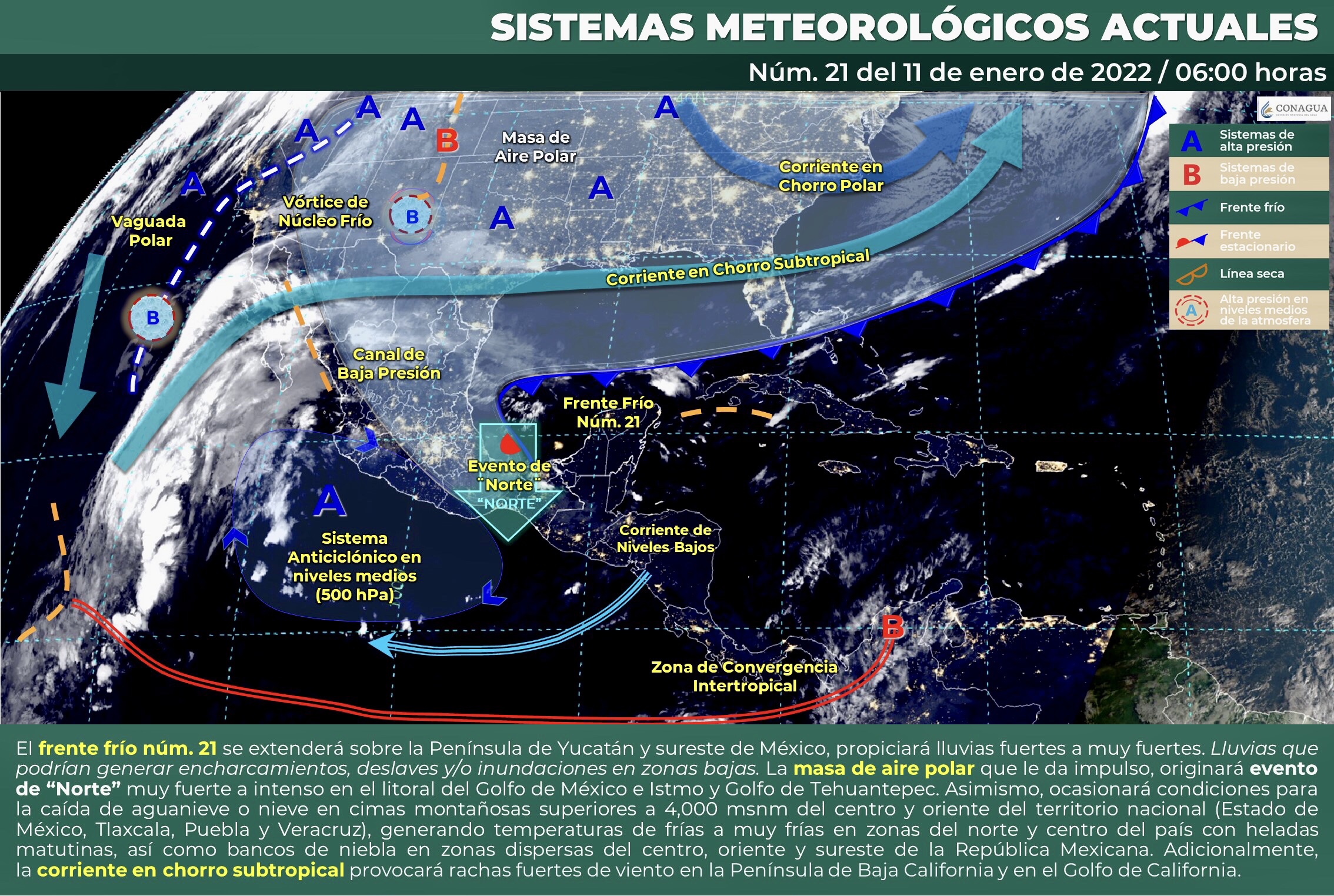 Este día, el frente frío núm. 21 se extenderá sobre la Península de Yucatán y sureste de México, en donde propiciará lluvias fuertes a muy fuertes. Lluvias que podrían generar encharcamientos, deslaves y/o inundaciones en zonas bajas. La masa de aire polar que le da impulso, originará evento de “Norte” muy fuerte a intenso en el litoral del Golfo de México e Istmo y Golfo de Tehuantepec. Asimismo, ocasionará condiciones para la caída de aguanieve o nieve en cimas montañosas superiores a 4,000 msnm del centro y oriente del territorio nacional (Estado de México, Tlaxcala, Puebla y Veracruz), generando temperaturas de frías a muy frías en zonas del norte y centro del país con heladas matutinas, así como bancos de niebla en zonas dispersas del centro, oriente y sureste de la República Mexicana. Adicionalmente, la corriente en chorro subtropical provocará rachas fuertes de viento en la Península de Baja California y en el Golfo de California.