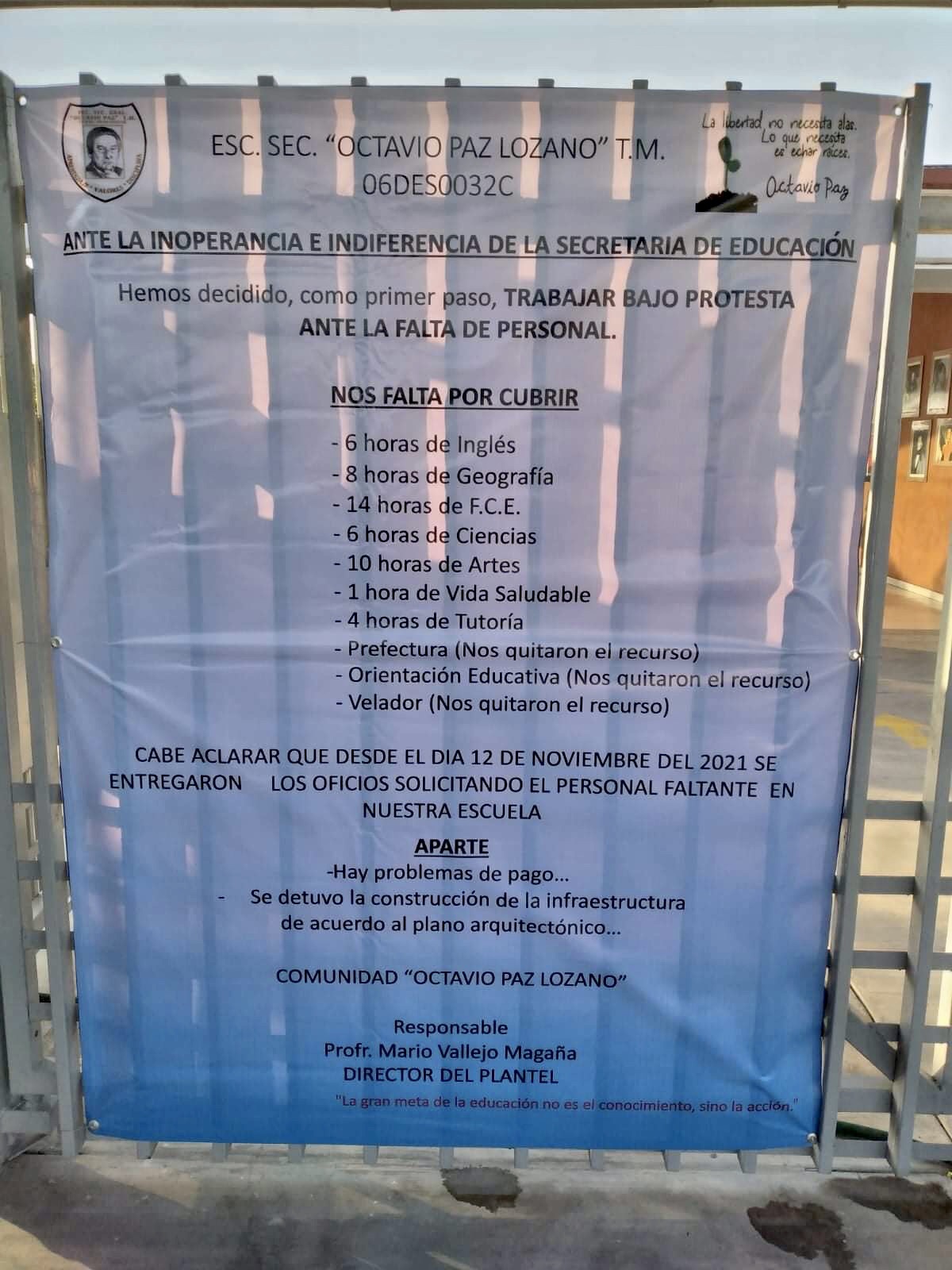 Vallejo Magaña, en la lona a la entrada del plantel, dio a conocer que el colectivo escolar de ese centro de trabajo labora bajo protesta ante la inoperancia e indiferencia de las autoridades de dicha secretaría.