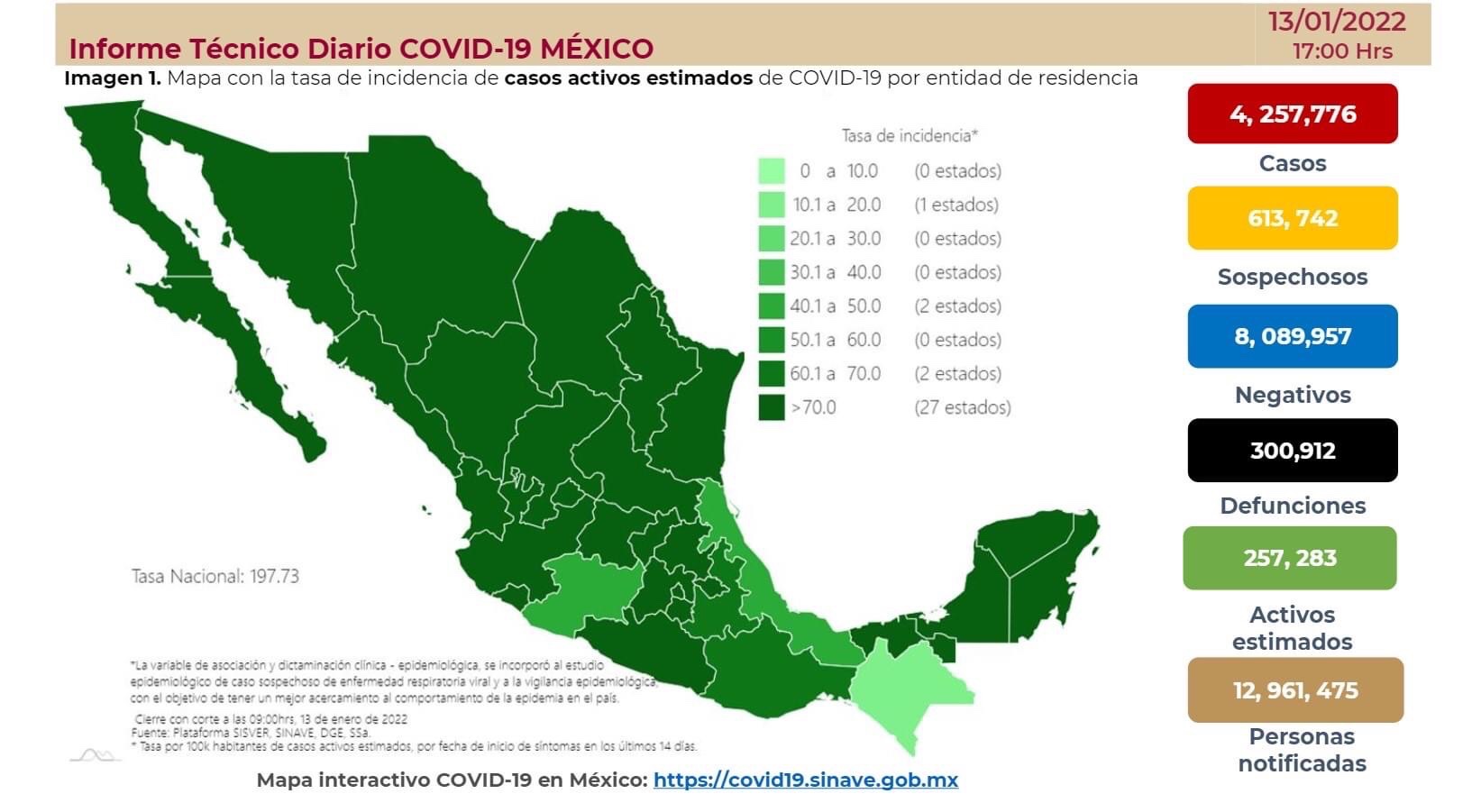 La Secretaría de Salud informó este jueves que México suma 4 millones 257 mil 776 casos y 300 mil 912 muertes por Covid-19