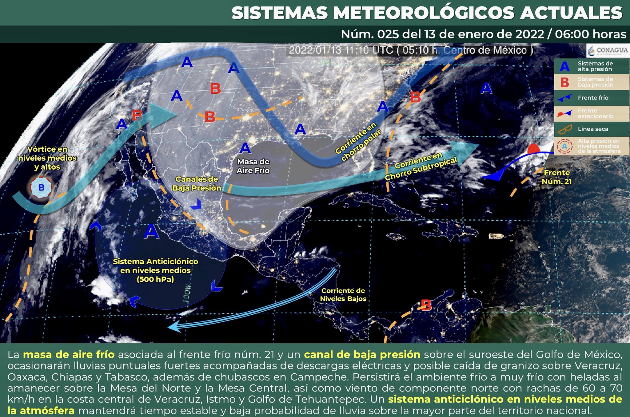 Este día, se pronostica que la masa de aire frío asociada al frente frío núm. 21 y un canal de baja presión sobre el suroeste del Golfo de México, ocasionarán lluvias puntuales fuertes acompañadas de descargas eléctricas y posible caída de granizo sobre Veracruz, Oaxaca, Chiapas y Tabasco, además de chubascos en Puebla y Campeche. Asimismo, persistirá el ambiente frío a muy frío con heladas al amanecer sobre la Mesa del Norte y la Mesa Central, así como viento de componente norte con rachas de 60 a 70 km/h en la costa central de Veracruz, Istmo y Golfo de Tehuantepec. Finalmente, un sistema anticiclónico en niveles medios de la atmósfera mantendrá tiempo estable y baja probabilidad de lluvia sobre la mayor parte del territorio nacional.