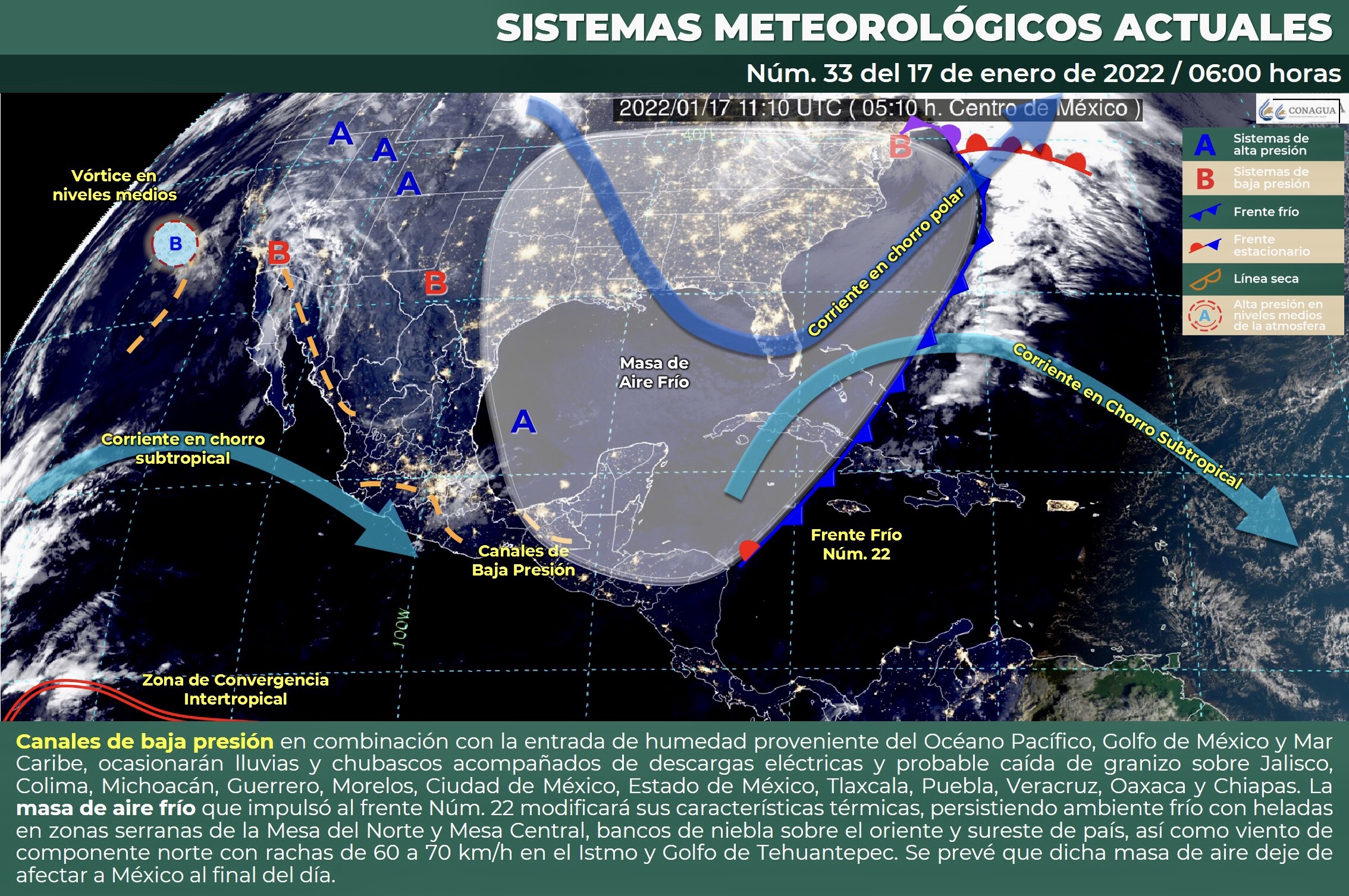 Este lunes, canales de baja presión sobre el occidente, centro y sur de México en combinación con la entrada de humedad proveniente del Océano Pacífico, Golfo de México y Mar Caribe, ocasionarán lluvias y chubascos acompañados de descargas eléctricas y probable caída de granizo sobre Jalisco, Colima, Michoacán, Guerrero, Morelos, Ciudad de México, Estado de México, Tlaxcala, Puebla, Veracruz, Oaxaca y Chiapas. La masa de aire frío que impulsó al frente Núm. 22 modificará sus características térmicas, no obstante, mantendrá el ambiente frío durante esta mañana con heladas en zonas serranas de la Mesa del Norte y Mesa Central, bancos de niebla sobre el oriente y sureste de país, además de viento de componente norte con rachas de 60 a 70 km/h en el Istmo y Golfo de Tehuantepec. Se prevé que dicha masa de aire deje de afectar a México al final del día.