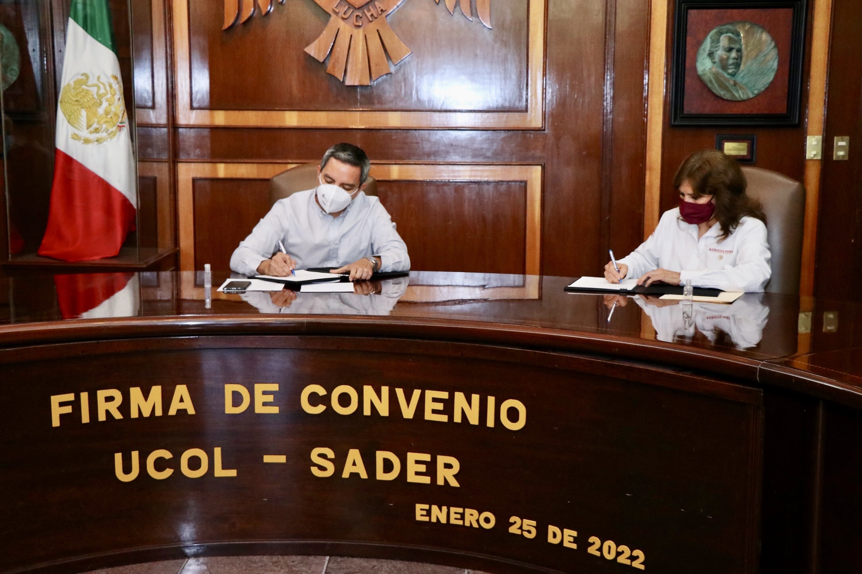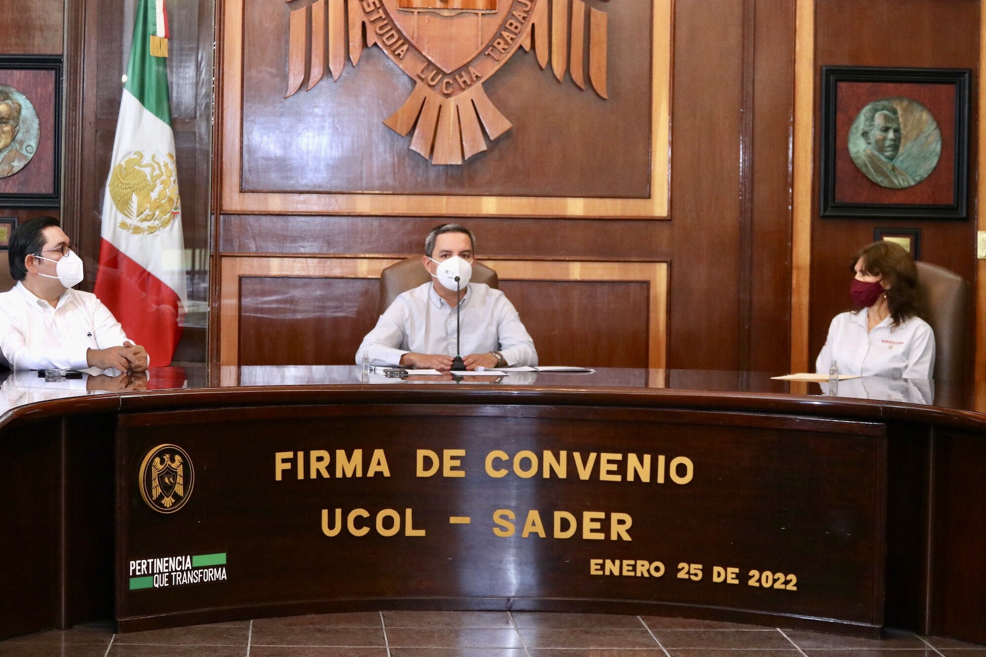 Este martes la Universidad de Colima, representada por su rector, el Dr. Christian Jorge Torres Ortiz Zermeño y la Oficina de Representación de la Secretaría de Agricultura y Desarrollo Rural (SADER) en el estado, a cargo de la Ing. María Esmeralda López Mendoza, firmaron un convenio de colaboración para realizar programas, proyectos y actividades en común y generar la transferencia de conocimiento entre ambas instituciones.