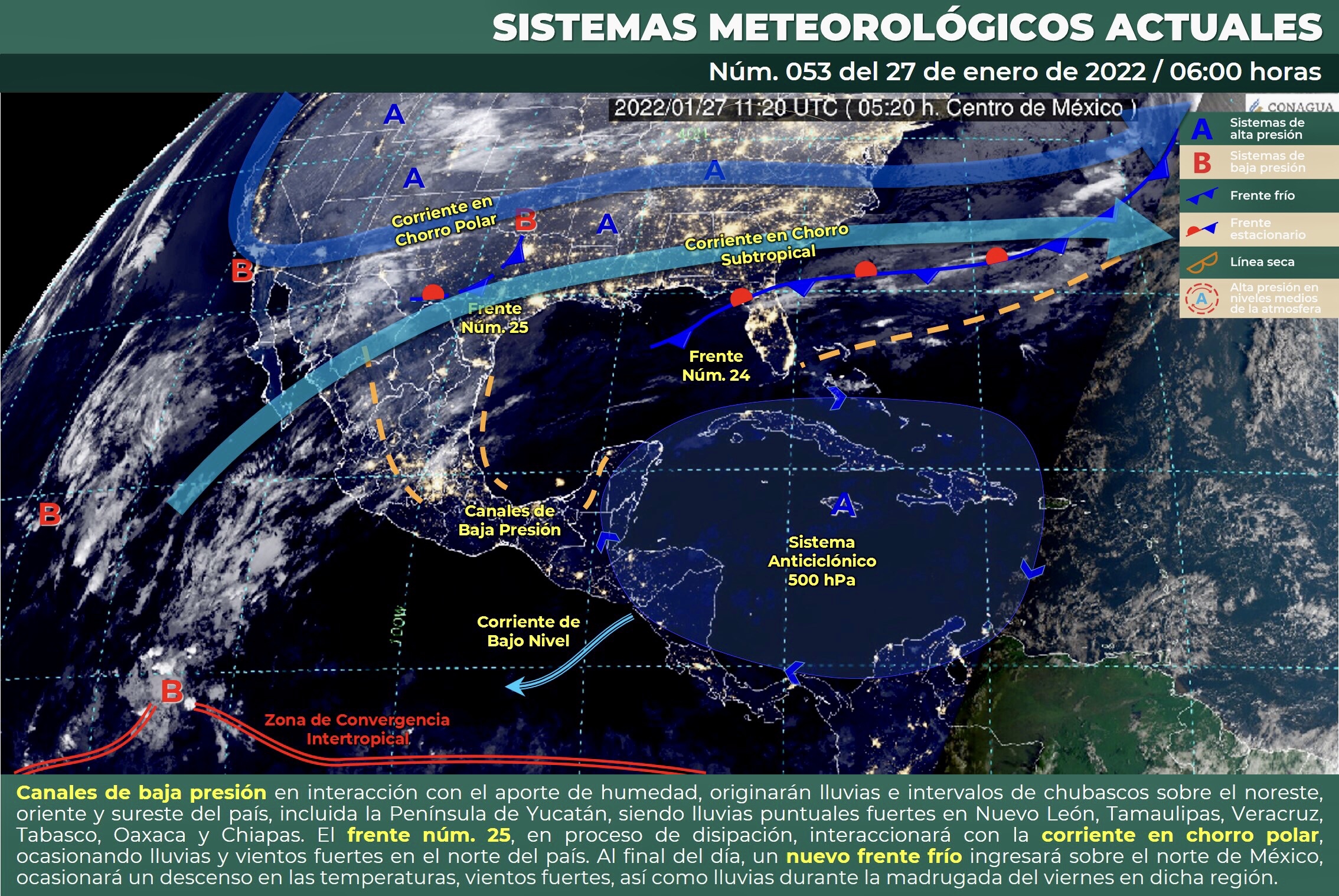 Canales de baja presión extendidos sobre el occidente del Golfo de México y la Península de Yucatán, en interacción con el aporte de humedad, originarán lluvias e intervalos de chubascos sobre el noreste, oriente y sureste de México, incluida la Península de Yucatán, siendo lluvias puntuales fuertes en zonas de Nuevo León, Tamaulipas, Veracruz, Tabasco, Oaxaca y Chiapas. Por su parte, el frente núm. 25, sobre el norte del territorio nacional y en proceso de disipación, interaccionará con la corriente en chorro polar y ocasionarán lluvias y vientos fuertes en el norte del país. Durante esta mañana, prevalecerá el ambiente frío a muy frío con heladas al amanecer y bancos de niebla en zonas montañosas del norte, oriente, centro, sur y sureste del territorio nacional. Al final del día, un nuevo frente frío ingresará sobre el norte de México, generará un nuevo descenso en las temperaturas e incremento en la velocidad del viento y en la probabilidad de lluvias durante la madrugada del viernes.