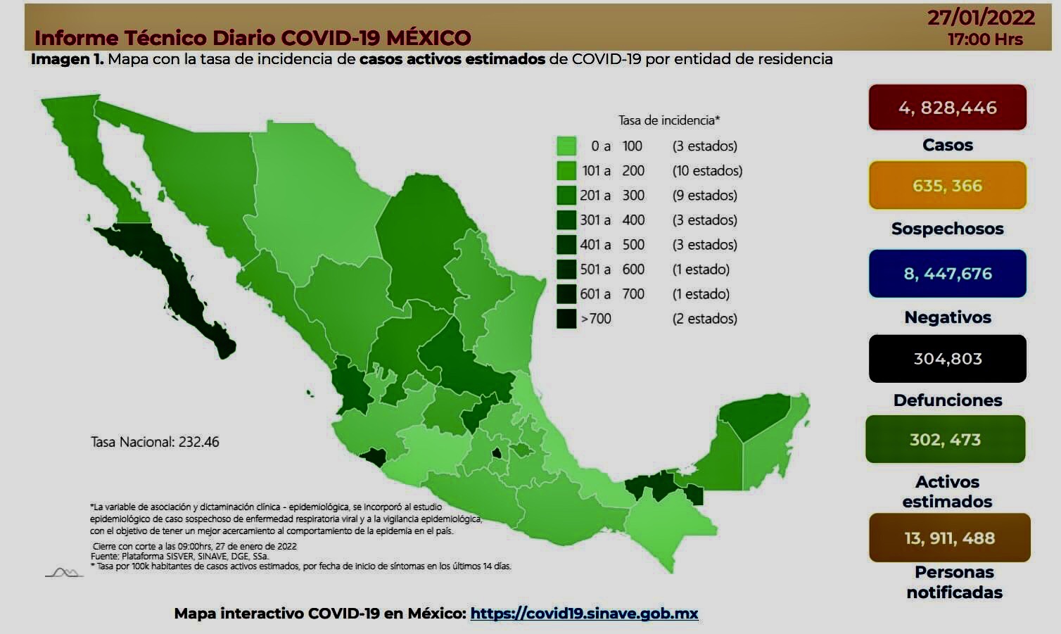 La Secretaría de Salud informó este jueves que México suma 4 millones 828 mil 446 casos y 304 mil 803 muertes por Covid-19