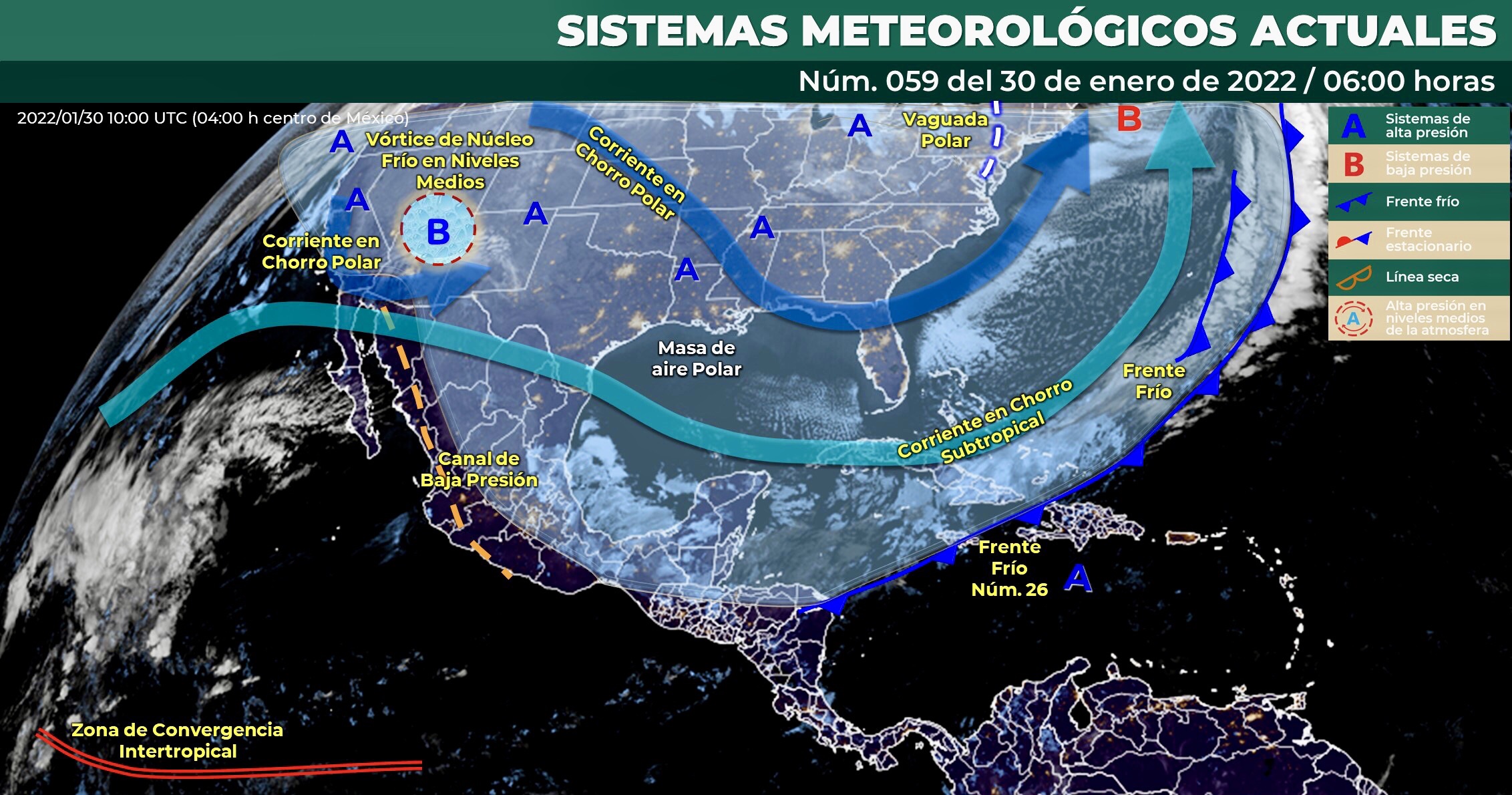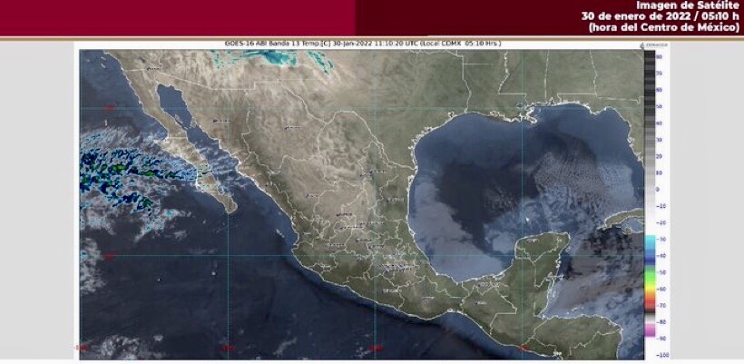 Para hoy, un nuevo frente frío y un canal de baja presión se extenderán sobre el norte y noreste del país y producirán chubascos en Coahuila y Tamaulipas, así como lluvias aisladas en Sonora, Chihuahua y Nuevo León, mientras que un vórtice de núcleo frío recorrerá lentamente el noroeste y norte de la República Mexicana, ocasionando vientos fuertes con tolvaneras en Sonora y Coahuila y muy fuertes con tolvaneras en Chihuahua. A su vez, se prevé la posible caída de aguanieve o lluvia engelante en el norte de Chihuahua y Coahuila. La masa de aire que impulsó al frente frío Núm. 26 comenzará a modificar sus características térmicas, favoreciendo un ascenso gradual de las temperaturas diurnas en gran parte del territorio nacional, manteniéndose el ambiente frío a muy frío durante la mañana y noche sobre entidades de la Mesa del Norte y la Mesa Central, con heladas matutinas en zonas altas y temperaturas matutinas extremadamente frías en sierras de Chihuahua. Asimismo, prevalecerá viento de componente norte con rachas de 70 a 80 km/h en el Istmo y Golfo de Tehuantepec, disminuyendo en el transcurso del día; mientras que en el litoral de Veracruz se establecerá viento de componente sur con rachas de hasta 60 km/h y de hasta 70 km/h en la costa de Tamaulipas. Por su parte, un canal de baja presión sobre el occidente del Golfo de México y la entrada de humedad de ambos litorales originarán lluvias y chubascos vespertinos sobre entidades del oriente, centro, sur y sureste del territorio mexicano.