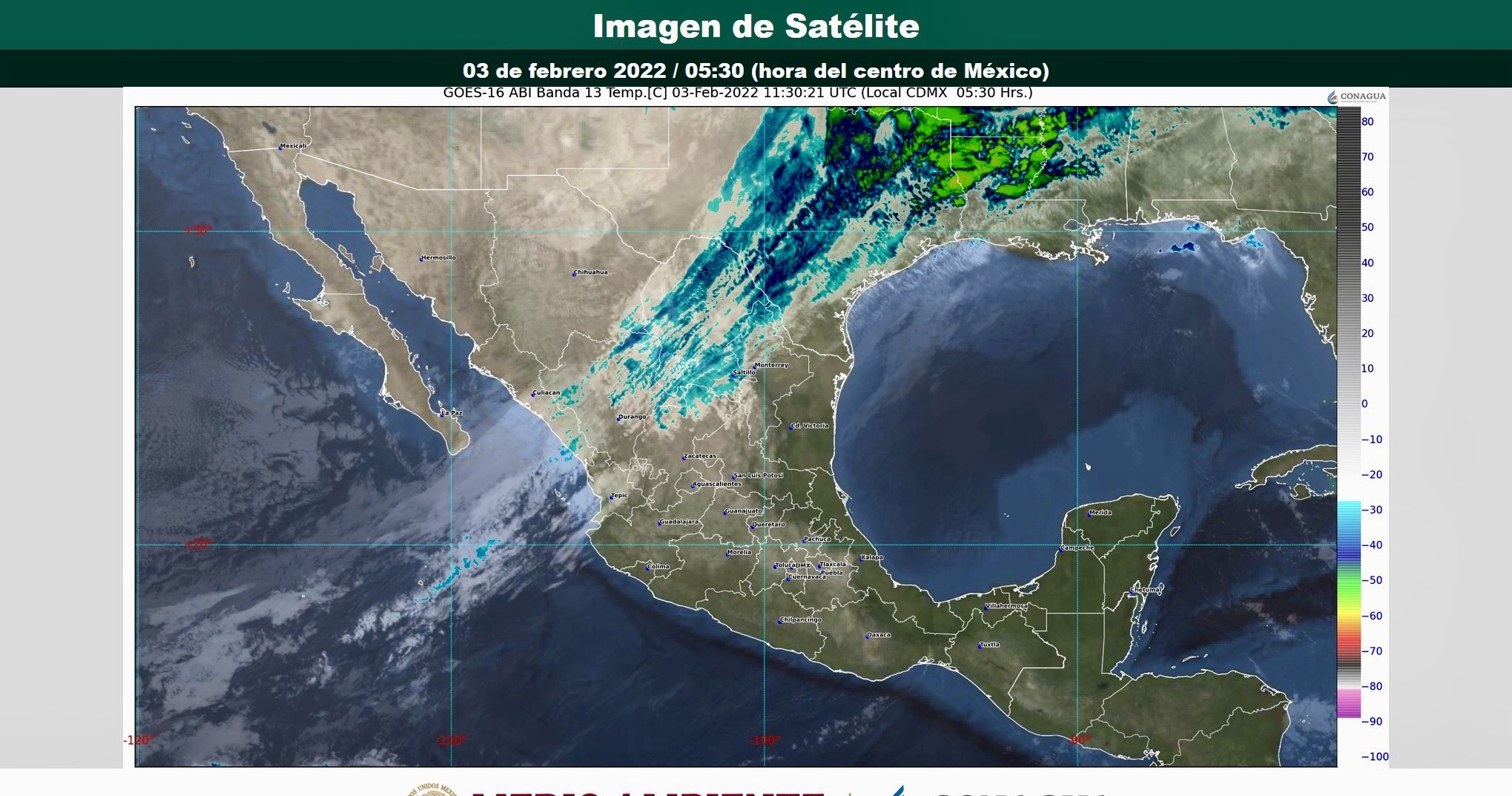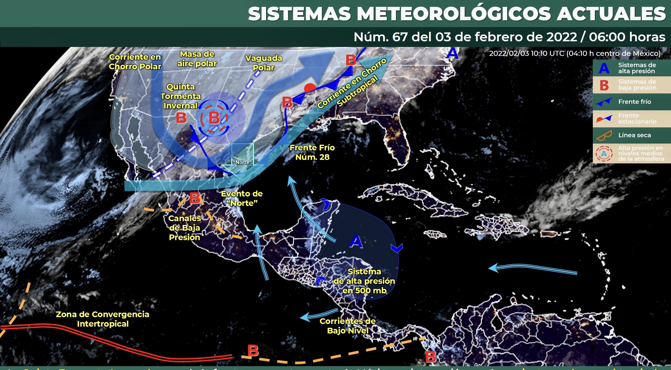 Para el día de hoy, la Quinta Tormenta Invernal, recorrerá el sur de Estados Unidos cerca de la frontera noroeste y norte de México, y en interacción con la entrada de humedad generada por la corriente en chorro subtropical y con la masa de aire polar asociada el frente frío Núm. 28, provocarán fuertes rachas de viento con probabilidad de tolvaneras, así como lluvias con intervalos de chubascos en las regiones mencionadas y con lluvias puntuales fuertes en Durango, además, persistirán condiciones para la caída de aguanieve o nieve en zonas serranas de Sonora, Sinaloa, Durango, Chihuahua y Coahuila durante la mañana, y en la madrugada del viernes en zonas altas de Chihuahua, Coahuila y Nuevo León. También prevalecerá el ambiente de muy frío a gélido con heladas al amanecer en zonas altas del noroeste y norte del territorio nacional. Por su parte, el frente frío Núm. 28 se desplazará sobre el noreste y gradualmente sobre el oriente de México, originando chubascos y lluvias puntuales fuertes en Puebla, Oaxaca y Veracruz, mientras que la masa de aire polar que lo impulsa, provocará evento de norte de muy fuerte a intenso con oleaje elevado en el litoral del estado de Tamaulipas, Veracruz y Tabasco. Hay probabilidad para la caída de aguanieve o nieve en cimas montañosas con altitudes superiores a 4,000 metros sobre el nivel medio del mar de Puebla, Tlaxcala y Veracruz.
