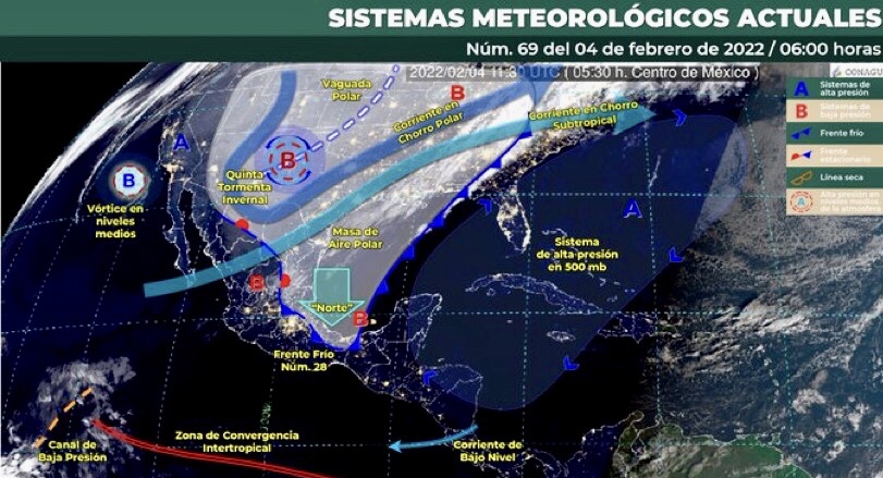 Este día, la Quinta tormenta invernal dejará de afectar al territorio nacional. Por otra parte, el frente frío Núm. 28 recorrerá el sureste de México y la Península de Yucatán, generando lluvias intensas a puntuales torrenciales sobre dichas regiones. La masa de aire polar que impulsa al frente, mantendrá ambiente de muy frío a gélido con heladas al amanecer en zonas altas del norte, noreste y centro del país; así mismo, en interacción con la entrada de humedad generada por la corriente en chorro subtropical mantendrá condiciones para la caída de aguanieve o nieve en sierras de Coahuila y Nuevo León; además de evento de “Norte” con rachas de fuertes a intensas y oleaje elevado en el litoral del Golfo de México, así como en el Istmo y Golfo de Tehuantepec. También, existen condiciones para la caída de aguanieve o nieve en sierras superiores a 4,000 metros de altura sobre el nivel medio del mar en los estados de Tlaxcala, Puebla y Veracruz. Adicionalmente, un vórtice en niveles medios de la atmósfera originará fuertes rachas de viento sobre el noroeste del territorio mexicano.