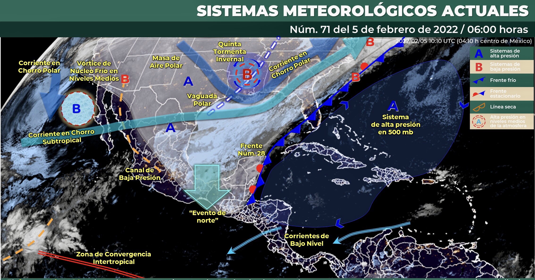 Para el día de hoy, el frente Núm. 28 se extenderá sobre el sureste mexicano y la Península de Yucatán con características de estacionario, ocasionará lluvias intensas a puntuales torrenciales en Chiapas y Tabasco; lluvias muy fuertes a puntuales intensas en Veracruz y Campeche, las cuales podrían generar desbordamiento de ríos y arroyos, deslaves e inundaciones en dichas entidades; lluvias fuertes con puntuales muy fuertes en Oaxaca e intervalos de chubascos en Yucatán y Quintana Roo. Mientras que, la masa de aire frío asociada al frente cubrirá gran parte del territorio nacional, ocasionando ambiente matutino frío a muy frío con heladas en el noreste, centro y oriente del país; además de densos bancos de niebla sobre la sierra Madre Oriental, y evento de “Norte” de muy fuerte a intenso con rachas de 90 a 110 km/h y oleaje elevado en el Istmo y litoral del Golfo de Tehuantepec; con rachas de 70 a 80 km/h en la costa centro y sur de Veracruz y rachas de 60 a 70 km/h en costas de Tamaulipas, Veracruz (norte), Tabasco y Campeche. Un vórtice de núcleo frío frente a costas de Baja California, en interaccióncon la corriente en chorro subtropical, ocasionarán vientos fuertes con tolvaneras en el noroeste y norte del país, además de mantener el ambiente frío en dichas regiones.