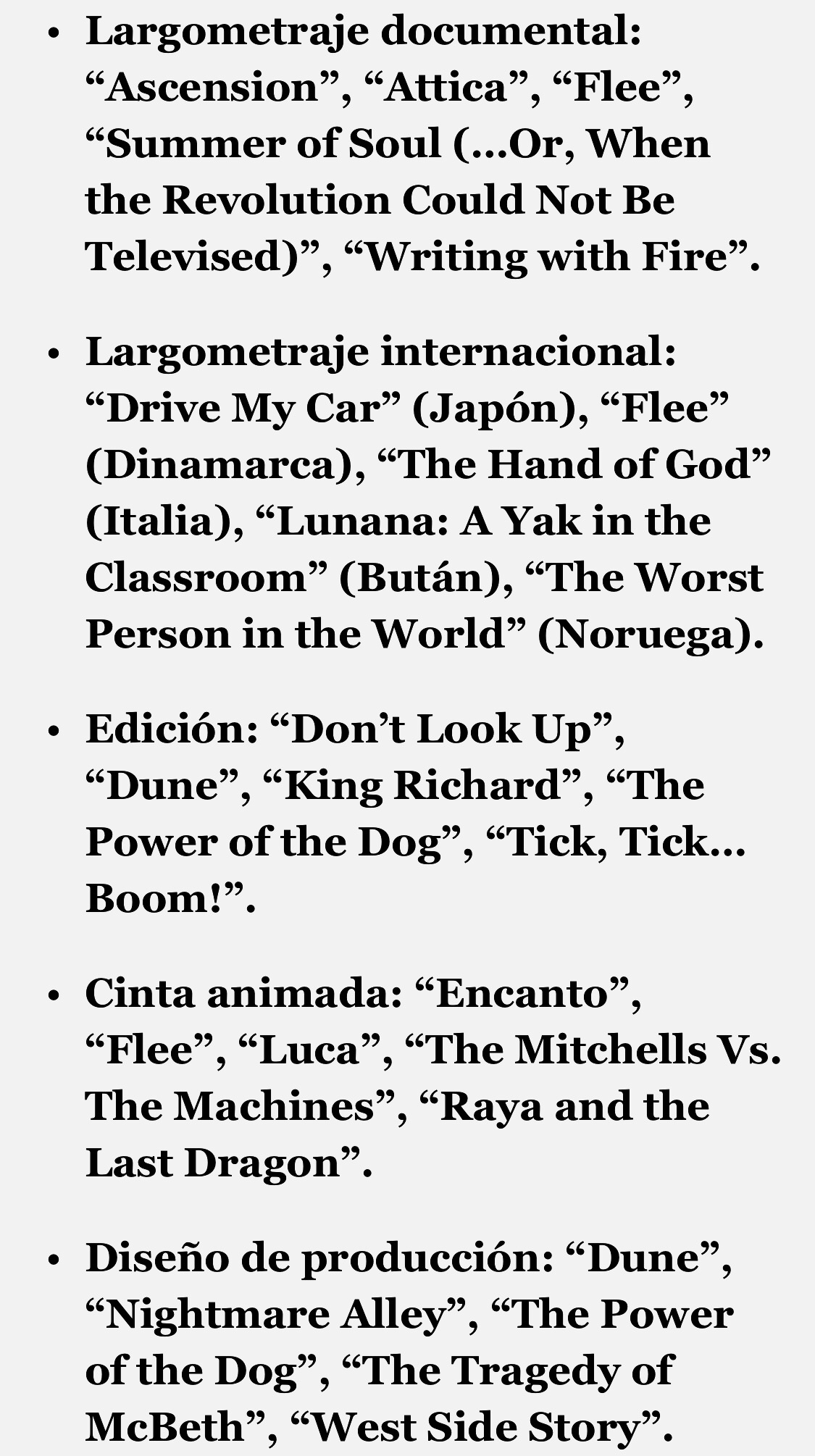 Mejor película: “Belfast”, “CODA”, “Don’t Look Up”, “Drive My Car”, “Dune”, “King Richard”, “Licorice Pizza”, “Nightmare Alley”, “The Power of the Dog”, “West Side Story”.