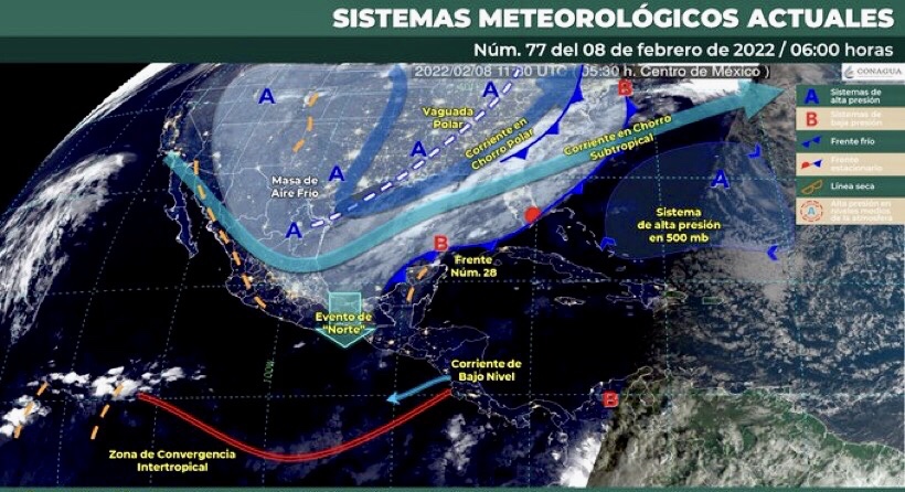 Durante este día, el frente núm. 28 recorrerá el sureste del país y la Península de Yucatán, ocasionará lluvias puntuales intensas en Veracruz, Tabasco y Chiapas; muy fuertes en Oaxaca y Quintana Roo; y lluvias fuertes en Puebla, Campeche y Yucatán. La masa de aire frío que impulsa al frente en combinación con la corriente en chorro subtropical mantendrá el ambiente frío a gélido con heladas al amanecer, lluvias y bancos de niebla en zonas altas del noreste, centro y oriente del país. Asimismo, prevalecerán las condiciones para caída de aguanieve o nieve durante esta mañana en zonas montañosas de Nuevo León, Tamaulipas, San Luis Potosí, además de cimas montañosas por arriba de los 4000 msnm en Tlaxcala, Puebla y Veracruz. Persistirá el evento de “Norte” muy fuerte a intenso, además de oleaje elevado en el litoral de Veracruz, Tabasco, Campeche, Yucatán, Istmo y Golfo de Tehuantepec. En el resto del país, prevalecerá tiempo estable y baja probabilidad de lluvias.