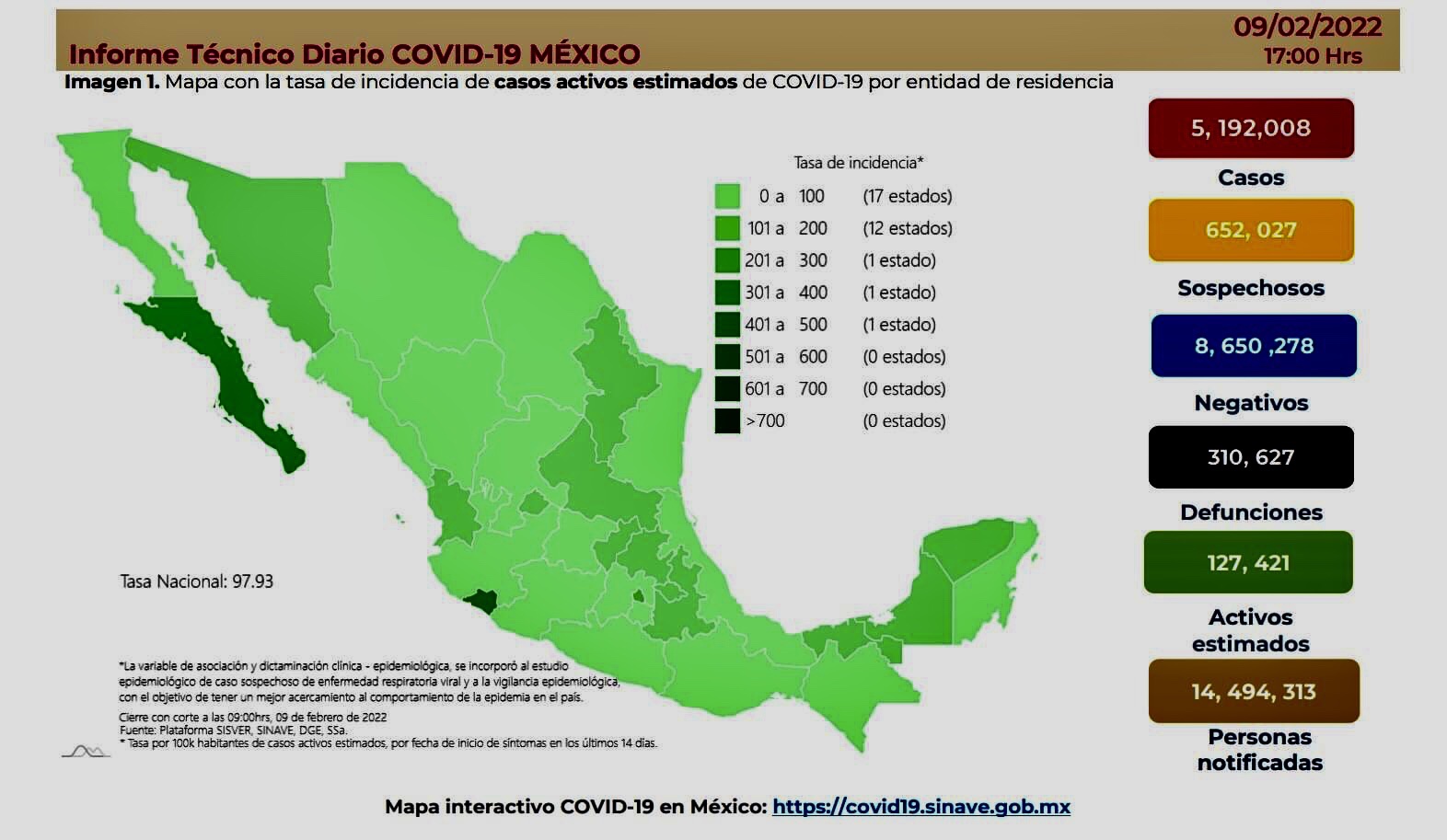En cuanto a la situación actual de la epidemia, se identificaron 127 mil 421 casos activos estimados, que equivalen a 2.3 por ciento del total registrado desde el inicio de la pandemia. En tanto, se reporta disminución de 43 por ciento en el número de casos estimados con respecto a la semana anterior.