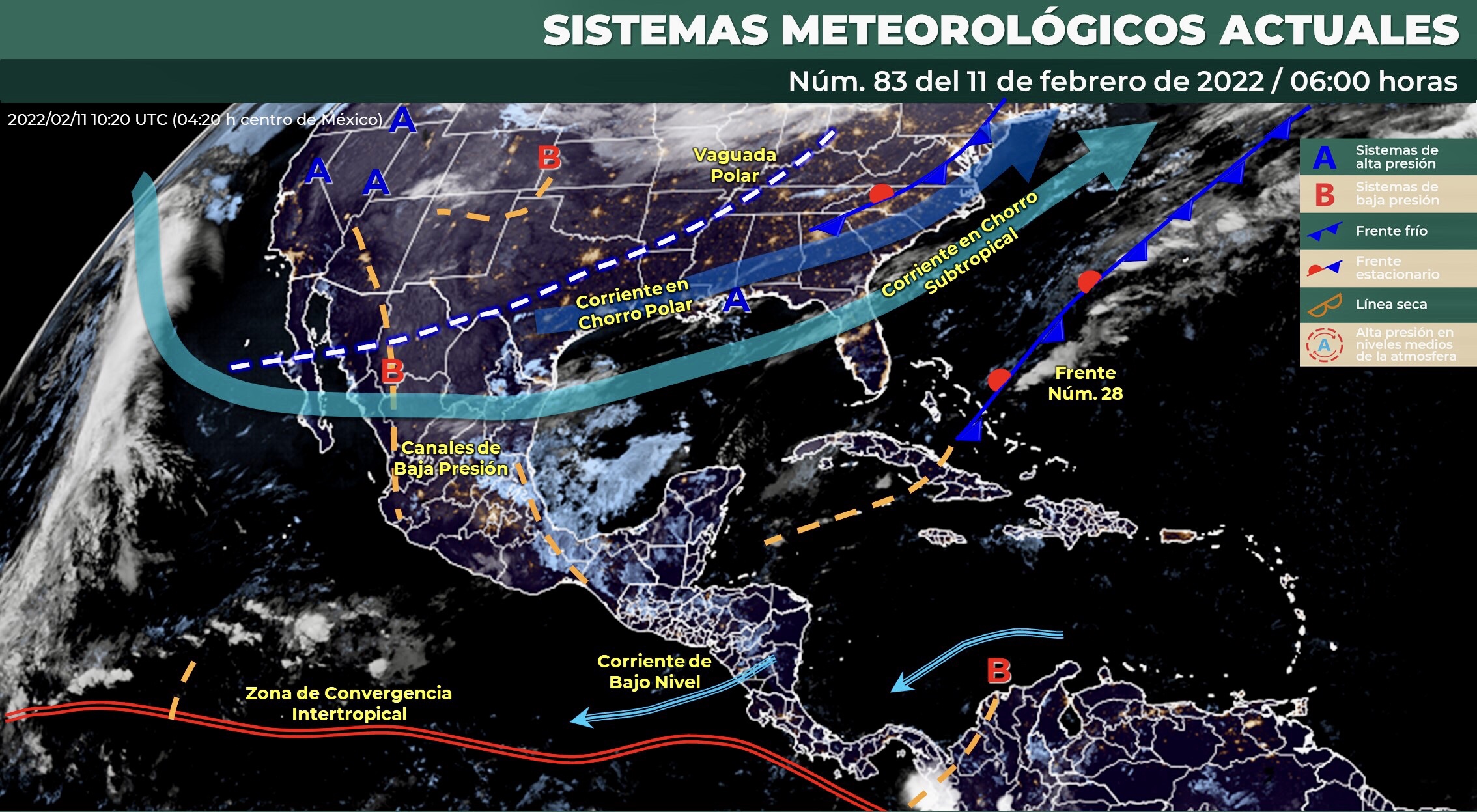 Para el día de hoy, la vaguada polar se extenderá desde la Península de Baja California hasta el noreste de la República Mexicana, manteniendo ambiente de muy frío a gélido en Chihuahua y Durango, así como ambiente frío a muy frío con heladas al amanecer en zonas altas del norte y centro de la República Mexicana; de igual manera en interacción con la corriente en chorro subtropical, provocarán por la tarde, fuertes rachas de viento en zonas del norte, occidente y centro del país y condiciones para la caída de aguanieve y/o lluvia engelante en sierras de Coahuila y Nuevo León. Por su parte, la entrada de humedad del Golfo de México y Mar Caribe, en interacción con un canal de baja presión en el sureste del territorio mexicano, ocasionarán lluvias puntuales fuertes en Tamaulipas e intervalos de chubascos en Nuevo León, San Luis Potosí, Hidalgo, Veracruz, Puebla, Oaxaca, Chiapas, Yucatán y Quintana Roo, las cuales se podrían acompañar de descargas eléctricas. Por otro lado, en horas de la noche, se pronostica la aproximación de un nuevo frente frío a la frontera norte del país, mismo que interaccionará con la corriente en chorro subtropical, generando fuertes rachas de viento de 50 a 70 km/h con tolvaneras en zonas de Chihuahua, Coahuila y Nuevo León.