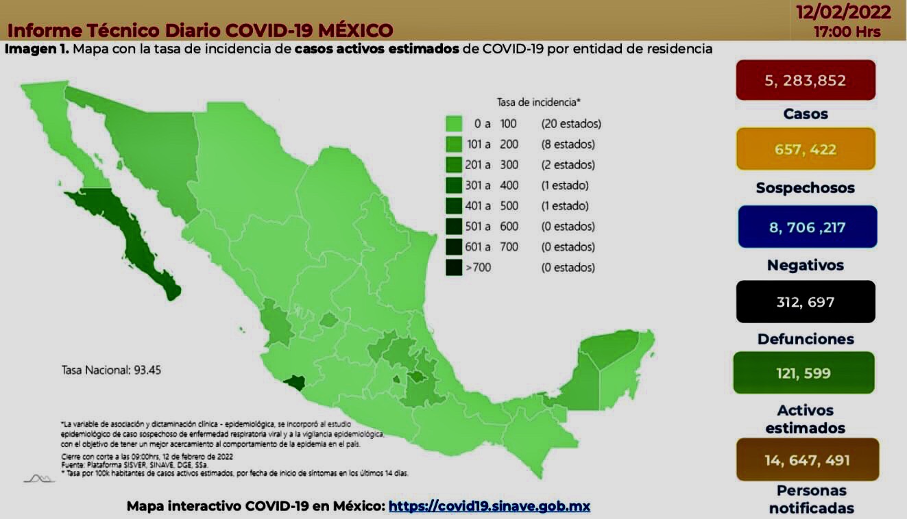 La Secretaría de Salud federal informó este sábado que México acumula cinco millones 283 mil 852 casos y 312 mil 697 muertes por COVID-19.