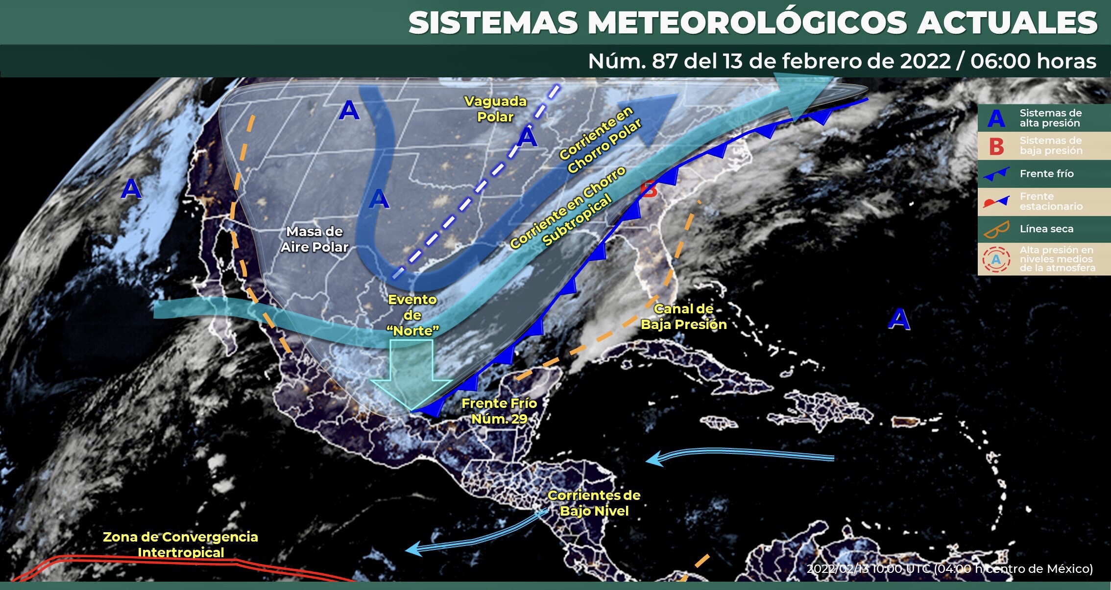 Para el día de hoy, el frente frío Núm. 29 recorrerá en el transcurso del día el oriente y sureste de México incluyendo la Península de Yucatán, propiciará lluvias puntuales torrenciales en Chiapas y Tabasco, intensas en Oaxaca y Veracruz, puntuales fuertes en Puebla Campeche y Quintana Roo, lluvias que podrían generar desbordamiento de ríos y arroyos, deslaves e inundaciones en zonas bajas. La masa de aire polar asociada al frente ocasionará marcado descenso de temperatura en gran parte del país, heladas matutinas sobre entidades de la Mesa del Norte y la Mesa Central, bancos de niebla en el noreste y oriente del territorio nacional, así como evento de “Norte” de 100 a 120 km/h en el Istmo y Golfo de Tehuantepec, rachas de 80 a 100 km/h en costas de Veracruz y Tabasco, de 80 km/h en costas de Tamaulipas y de 60 km/h en las costas de la Península de Yucatán. Con oleaje de 3 a 5 metros de altura en costas de Veracruz, Tabasco y en el Golfo de Tehuantepec y de 1 a 3 metros de altura en costas de Tamaulipas, Campeche, Yucatán y Quintana Roo. Asimismo, se mantendrá la posibilidad para la caída de nieve o aguanieve durante la mañana en cimas montañosas por arriba de los 4000 msnm del centro y oriente de la República Mexicana (Estado de México, Tlaxcala, Puebla y Veracruz). Por otra parte, el ingreso de humedad del Océano Pacífico y Golfo de México, ocasionará lluvias e intervalos de chubascos en el occidente, centro y sur del país.