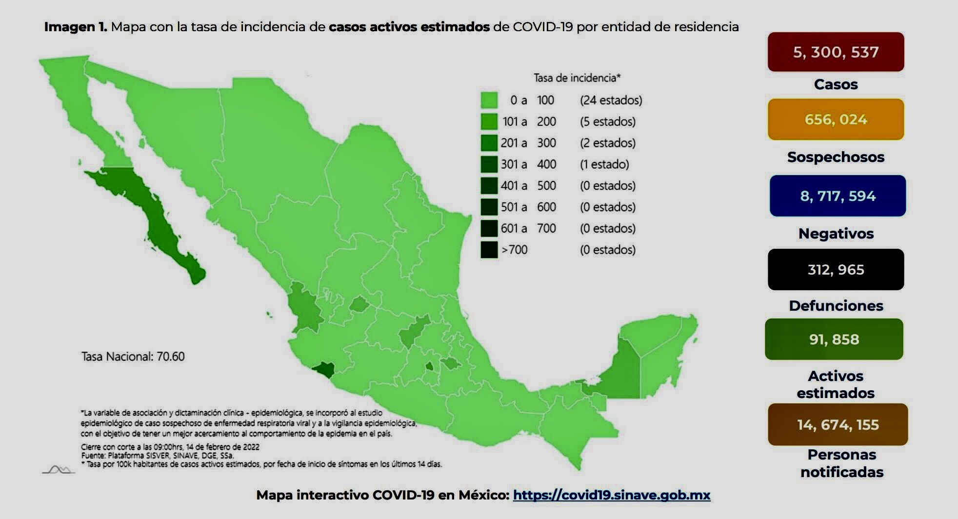 En esta semana epidémica se reporta reducción de 48 por ciento en casos estimados comparado con el periodo previo; 91 mil 858 personas presentaron signos y síntomas en los últimos 14 días, se consideran casos activos y equivalen a 1.6 por ciento del total durante la pandemia.