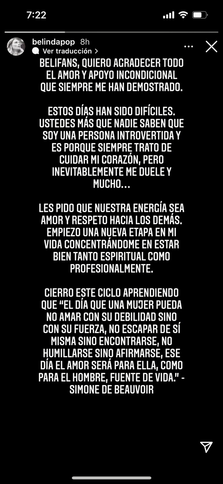 “Quiero agradecer todo el amor y apoyo incondicional que siempre me han demostrado. Estos días han sido difíciles. Ustedes más que nadie saben que soy una persona introvertida y es porque siempre trato de cuidar mi corazón, pero inevitablemente me duele y mucho…