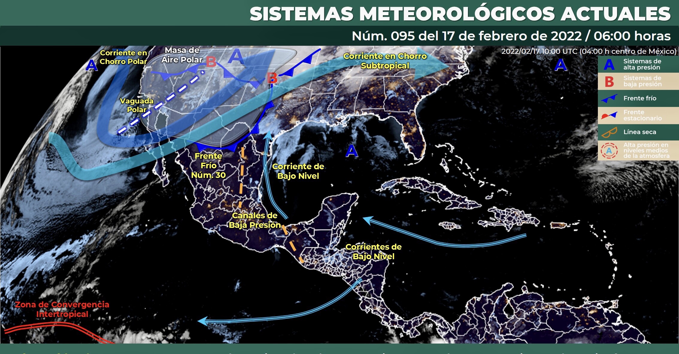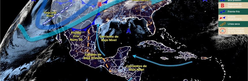 Para hoy, el frente frío núm. 30 se desplazará sobre el noreste y parte del oriente del territorio nacional, ocasionando chubascos en Hidalgo, Querétaro y San Luis Potosí (este) y lluvias puntuales fuertes con descargas eléctricas en Veracruz y Puebla (norte). Por la mañana, antes del paso de dicho frente, un sistema de alta presión en el Golfo de México ocasionará viento de componente sur (surada) con rachas de 60 a 80 km/h y posibles tolvaneras en Nuevo León y Tamaulipas, y rachas de 60 a 70 km/h en costas del norte y centro de Veracruz. La masa de aire frío que impulsa al frente frío núm. 30 originará nuevo descenso de temperatura y fuertes rachas de viento en el norte y noreste de México, así como evento de “Norte” muy fuerte en las costas de Tamaulipas y fuerte en el norte de Veracruz en horas de la noche y madrugada del viernes. Por otro lado, una vaguada polar se localizará sobre el noroeste del país, ocasionando lluvias aisladas y probabilidad de lluvia engelante en Chihuahua. Por último, la entrada de humedad del Océano Pacífico y Mar Caribe en interacción con un canal de baja presión en el centro del país y otro en el sureste, originarán lluvias aisladas en el centro, sur y sureste del país, incluyendo a la Península de Yucatán con descargas eléctricas en zonas de Michoacán, Guerrero y Oaxaca.