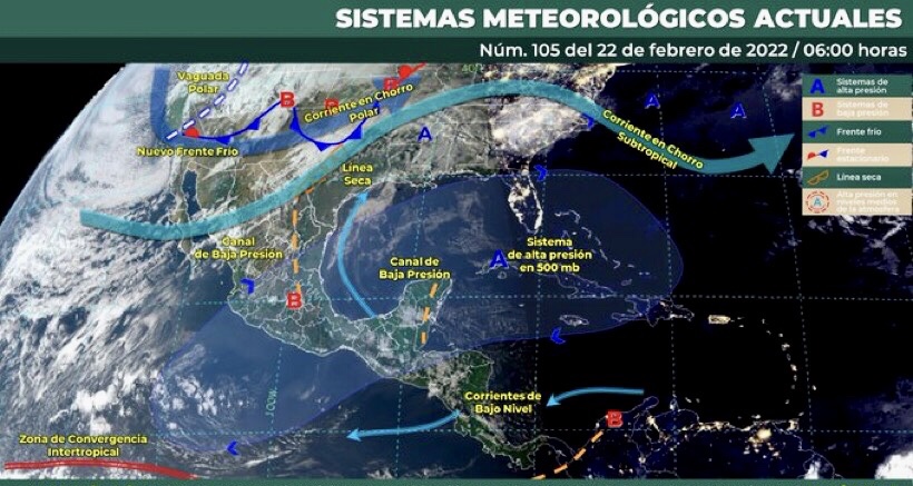 Este martes, una vaguada polar sobre el noroeste de México, en combinación con el transporte de humedad generado por la corriente en chorro subtropical y la aproximación de un nuevo frente frío, ocasionará lluvias con intervalos de chubascos en Baja California, ambiente frío sobre el norte y noroeste del país, con probable caída de aguanieve o nieve en La Rumorosa y San Pedro Mártir, B.C., además de vientos intensos con rachas de 70 a 90 km/h y tolvaneras en Baja California, Sonora, Chihuahua y Durango. Por otra parte, una línea seca sobre Coahuila generará rachas de viento de 50 a 70 km/h en Coahuila, Nuevo León y Tamaulipas, mientras que la circulación de un sistema de alta presión sobre el Golfo de México ocasionará viento de componente sur con rachas de 50 a 70 km/h a lo largo del litoral del Golfo de México y en la Península Yucatán, así como ambiente vespertino cálido a caluroso y baja probabilidad de lluvia, con excepción del centro del país, donde se pronostican lluvias dispersas por la tarde.