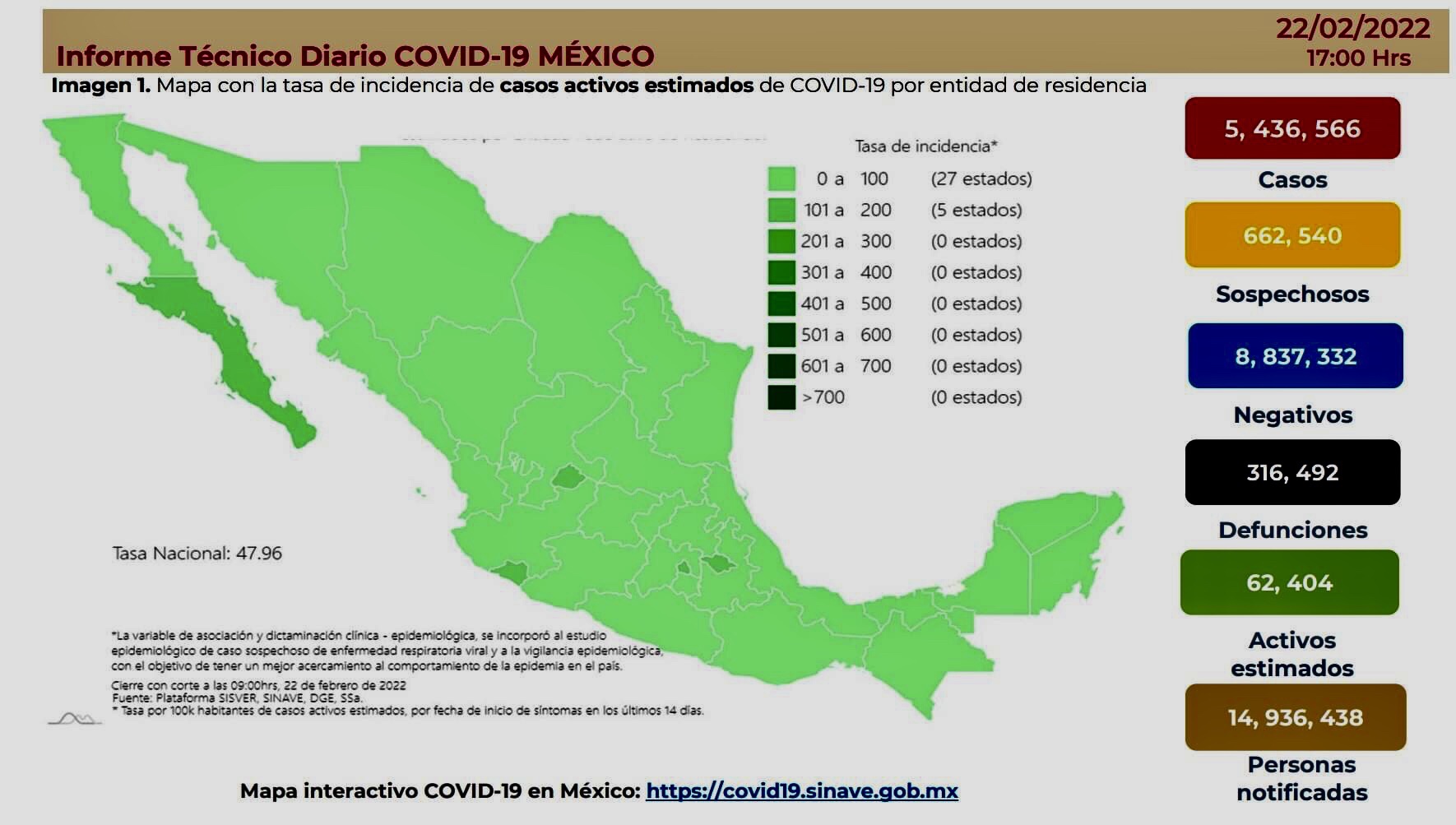La Secretaría de Salud informó este martes que México suma 5 millones 436 mil 566 contagios y 316 mil 492 defunciones por Covid-19.