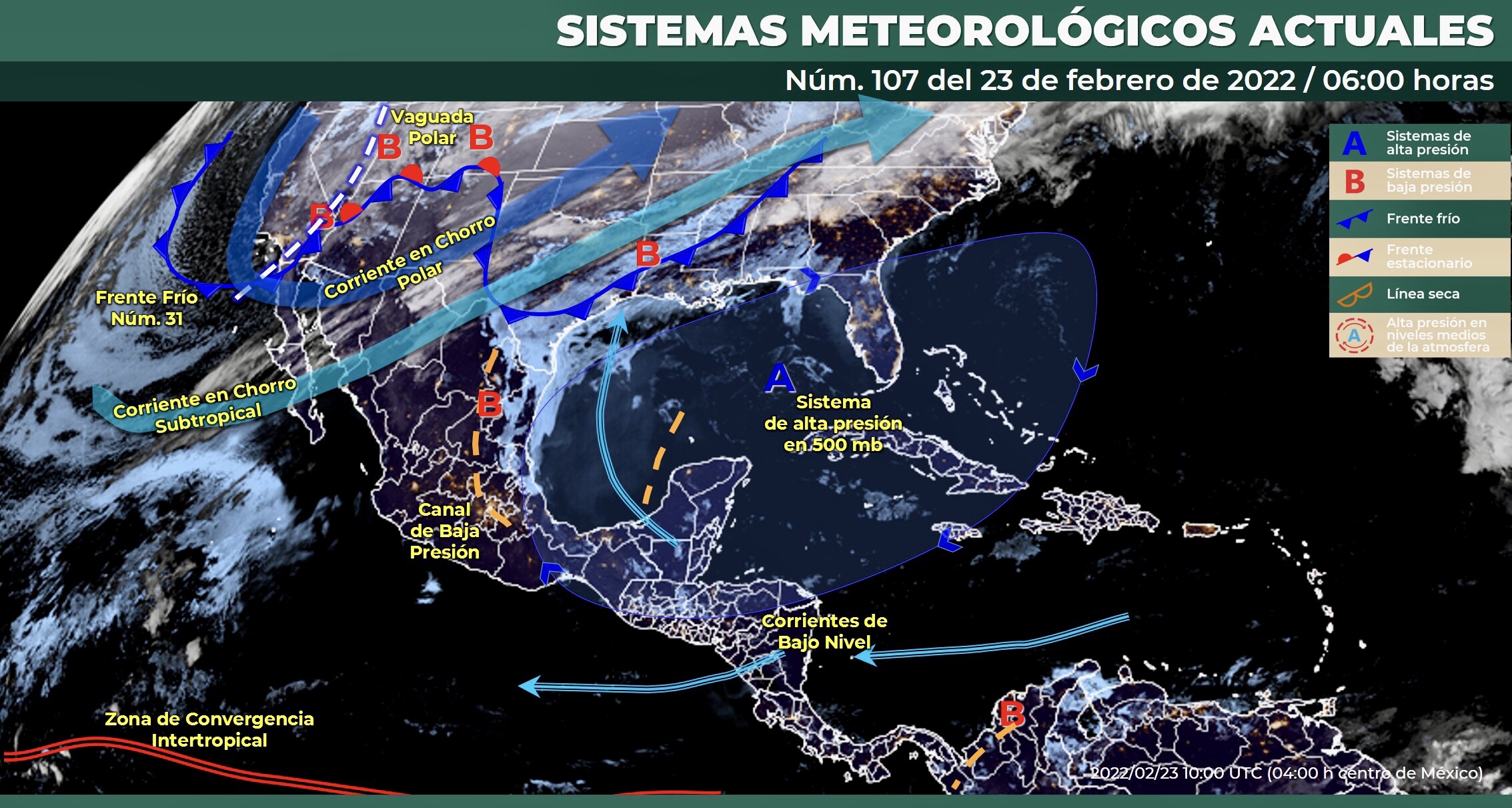 Para el día de hoy, el frente frío Núm. 31 en interacción con una vaguada polar, la corriente en chorro polar y el ingreso de humedad generado por la corriente en chorro subtropical provocarán vientos fuertes a intensos con rachas de 90 a 110 km/h en Baja California, Sonora y Chihuahua; de 60 a 80 km/h en Durango y en el Golfo de California; y de 50 a 70 km/h en Baja California Sur, Nuevo León, Zacatecas y San Luis Potosí, previéndose tolvaneras en dichas entidades. Así como lluvias y chubascos dispersos acompañados de descargas eléctricas en zonas de Baja California y Sonora. Asimismo, prevalecerá ambiente frío a gélido con posibilidad para la caída de nieve o aguanieve en las sierras de Baja California (La Rumorosa y San Pedro Mártir), Sonora (norte) y Chihuahua (noroeste). La entrada de humedad del Mar Caribe y Golfo de México generarán intervalos de chubascos en Quintana Roo y lluvias aisladas en Coahuila, Nuevo León y Tamaulipas con posibles descargas eléctricas. Por otro lado, un anticiclón en niveles medios de la atmósfera ocasionará ambiente vespertino caluroso a muy caluroso y escaso potencial de lluvia en gran parte del territorio nacional (excepto en el noroeste, norte y noreste). Por último, se prevé viento de componente sur (“surada”) con rachas desde 50 hasta 70 km/h a lo largo del litoral del Golfo de México (desde Tamaulipas hasta Yucatán).