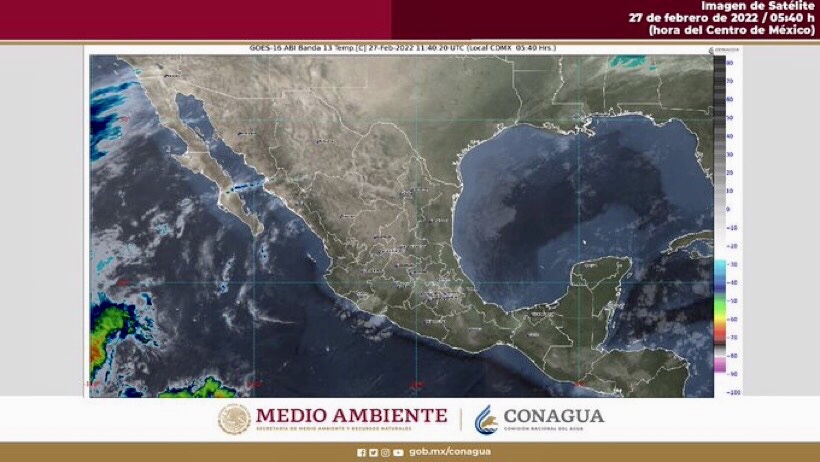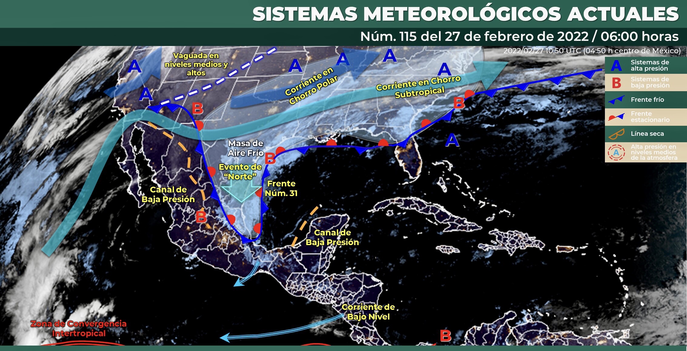 Por otro lado, un canal de baja presión sobre la Península de Yucatán originará lluvias y chubascos en Campeche, Yucatán y Quintana Roo; mientras que la entrada de humedad del Océano Pacífico originará lluvias aisladas sobre entidades del occidente y sur de la República Mexicana. Asimismo, la corriente en chorro subtropical en interacción con una vaguada en niveles medios y altos de la atmósfera, originarán vientos fuertes con rachas de 50 a 60 km/h y propagación de nubosidad media y alta sobre Baja California, Baja California Sur, Sonora, Coahuila, Zacatecas, San Luis Potosí, Jalisco, Guanajuato, Puebla, costa de Sinaloa y Golfo de California. Finalmente, un Anticiclón en niveles medios y altos de la atmósfera ocasionará ambiente vespertino cálido a caluroso en el noroeste, occidente, centro, sur y sureste del territorio nacional.