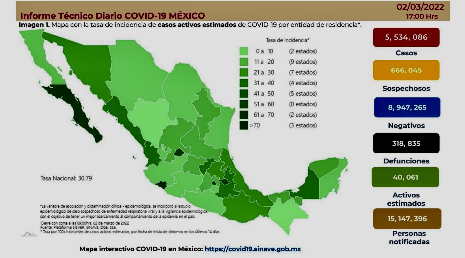 México reportó este miércoles 304 nuevas muertes y 12 mil 342 contagios por COVID-19, con lo que totaliza 5 millones 534 mil 86 casos y acumula 318 mil 531 decesos en total, informó la Secretaría de Salud.