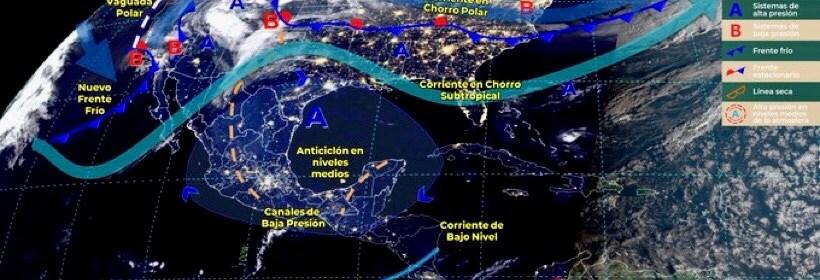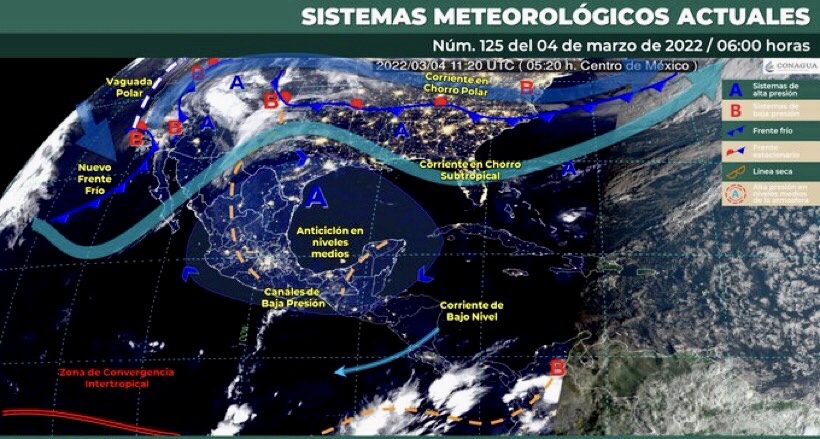 Durante este día, un nuevo frente frío se desplazará sobre el noroeste del territorio nacional e interaccionará con una vaguada polar y con la corriente en chorro subtropical, ocasionando fuertes rachas de viento con tolvaneras en dicha región, así como en el Golfo de California, además de condiciones para lluvias con intervalos de chubascos en Baja California y lluvias aisladas en Sonora y con la probabilidad para la caída de aguanieve o nieve en la sierra norte de Baja California. Por su parte, una línea seca se establecerá al norte del estado de Coahuila y generará rachas de viento con probabilidad de tolvaneras en el noreste del país. Dos canales de baja presión, uno sobre el interior de México y otro sobre el sureste de la República Mexicana, en interacción con la entrada de humedad del Océano Pacífico, Golfo de México y Mar Caribe, provocarán lluvias e intervalos de chubascos en el noreste, occidente, centro, sur, oriente y sureste del territorio mexicano, así como en la Península de Yucatán. Finalmente, un anticiclón en niveles medios de la atmósfera, mantendrá ambiente vespertino cálido a caluroso sobre la mayor parte del territorio nacional y ambiente frío a muy frío durante la madrugada y noche con heladas al amanecer en zonas montañosas de la Mesa del Norte y la Mesa Central.