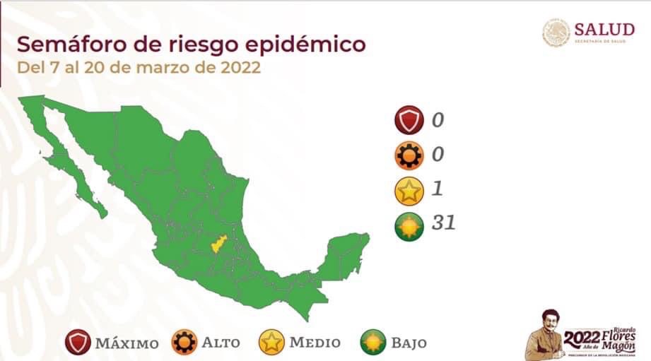 Con 31 entidades federativas en color verde y una en amarillo, el lunes entra en vigor el Semáforo de Riesgo Epidémico COVID-19, que tendrá vigencia hasta el 20 de marzo, informó la Secretaría de Salud.