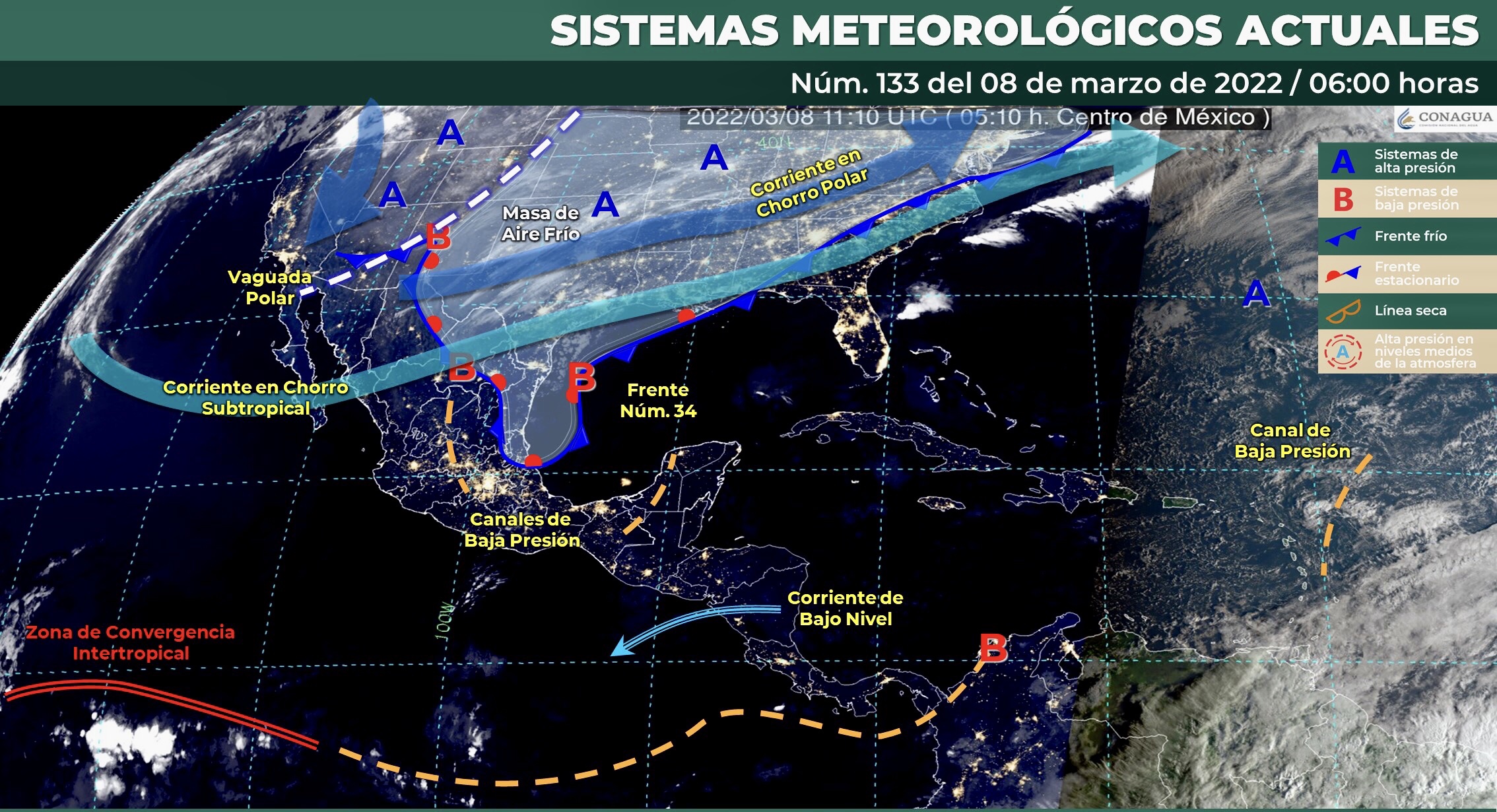 Durante este día, el frente núm. 34 se extenderá con características de estacionario sobre el occidente del Golfo de México, así como sobre el noreste y oriente del territorio nacional, ocasionará lluvias e intervalos de chubascos en dichas regiones. La masa de aire frío asociada al frente, en interacción con una vaguada polar y la corriente en chorro subtropical sobre el noroeste de México, ocasionarán ambiente frío a muy frío durante la mañana y noche, con heladas matutinas en zonas altas de la Mesa del Norte, Mesa Central y noroeste del país, así como rachas de viento fuerte a muy fuerte y bancos de niebla en el noroeste, norte, centro y oriente de la República Mexicana. Por otro lado, el ingreso dehumedad del Océano Pacífico, Golfo de México y Mar Caribe, propiciará lluvias e intervalos de chubascos en el centro, sureste y Península de Yucatán. Finalmente, se mantendrá el tiempo estable, seco, cálido a caluroso y escasa probabilidad de lluvias sobre entidades del occidente y sur del país.