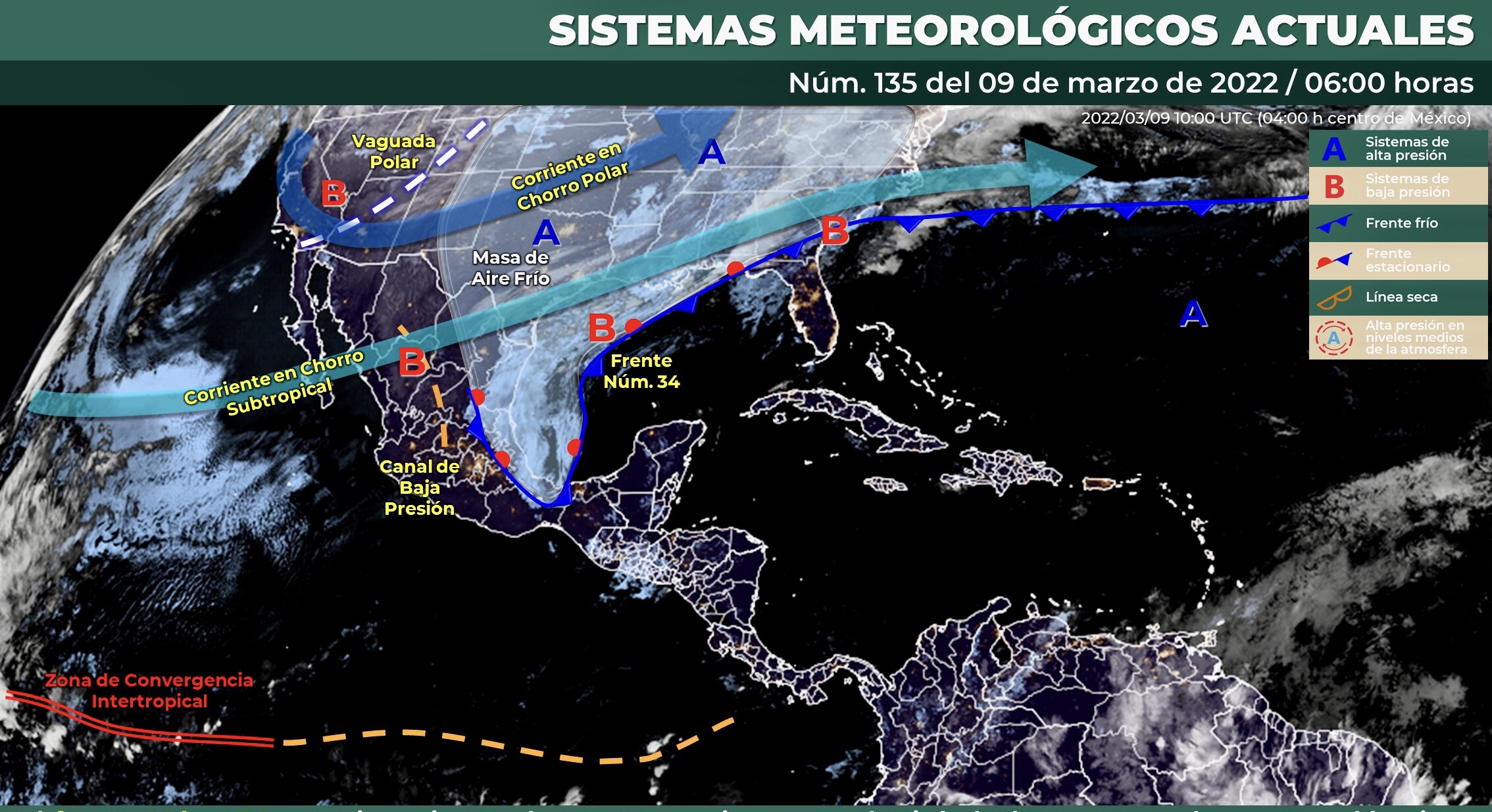 Para hoy, el frente Núm. 34 se localizará como estacionario en el sureste mexicano, lo que producirá chubascos acompañados de descargas eléctricas en San Luis Potosí, Hidalgo, Puebla, Veracruz y Chiapas. La masa de aire frío asociada, originará densos bancos de niebla en el noreste y oriente del país, además de viento de componente norte con rachas de 50 a 60 km/h en las costas de Tamaulipas y de 60 a 70 km/h en costas de Veracruz. Persistirá el ambiente frío a muy frío en la Mesa del Norte y Mesa Central, con heladas al amanecer sobre sus zonas altas, las cuales estarán acompañadas de temperaturas mínimas gélidas en sierras de Durango y Chihuahua. Por otra parte, un canal de baja presión en el norte y centro del país, originará vientos fuertes y tolvaneras en la Mesa del Norte y Mesa Central, incluido el Valle de México. En contraste, se pronostica ambiente vespertino cálido a caluroso en gran parte de la República Mexicana, con temperaturas máximas de 40 a 45 °C en zonas costeras de Sinaloa, Nayarit, Michoacán, Guerrero, Campeche y Yucatán.