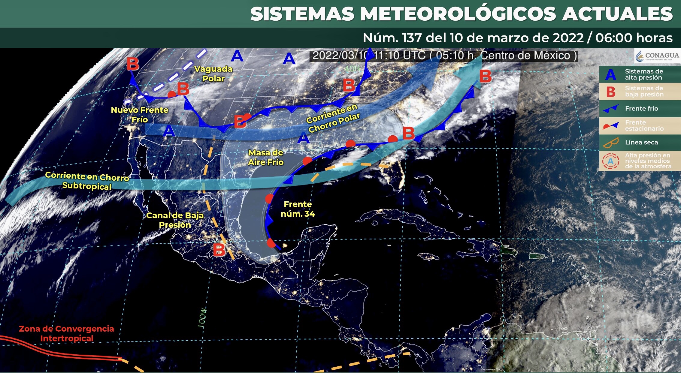 Este día, el frente Núm. 34 se extenderá sobre el Golfo de México, dejando de afectar gradualmente al país. La masa de aire frío que originó al frente mantendrá densos bancos de niebla en zonas de Nuevo León, Tamaulipas y Veracruz, además de ambiente muy frío con heladas al amanecer en sierras del noroeste, norte y centro de México; sin embargo, a lo largo del día modificará sus características térmicas permitiendo ascenso de las temperaturas. Por otra parte, un canal de baja presión originará lluvias con intervalos de chubascos en Chiapas y Tabasco. Por la noche, un nuevo frente frío, asociado con una vaguada polar, ingresará sobre el noroeste del territorio mexicano e interaccionará con la corriente en chorro subtropical, generando lluvias y chubascos en Baja California y Sonora; vientos fuertes en el noroeste y norte de país, así como condiciones para la caída de aguanieve o nieve en sierras de Baja California y Sonora. Finalmente, continuará el ambiente vespertino caluroso a muy caluroso en gran parte de la República Mexicana con temperaturas máximas de 40 a 45 °C en zonas de Michoacán, Guerrero, Campeche y Yucatán.