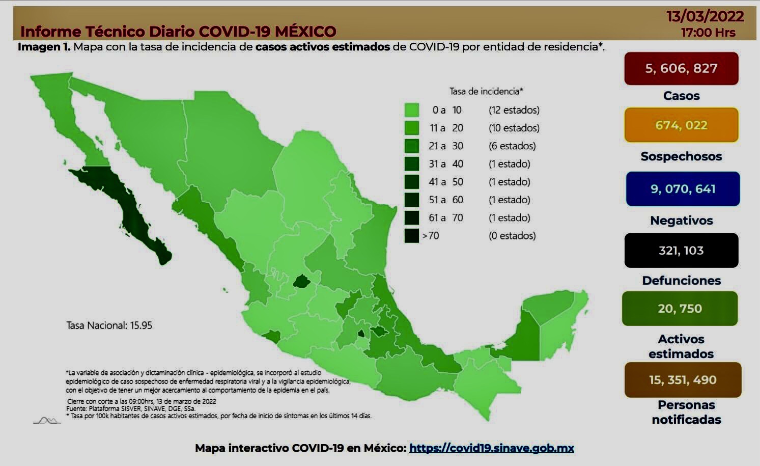 La Secretaría de Salud informó este domingo que México suma 5 millones 606 mil 827 casos y 321 mil 103 defunciones por COVID-19.