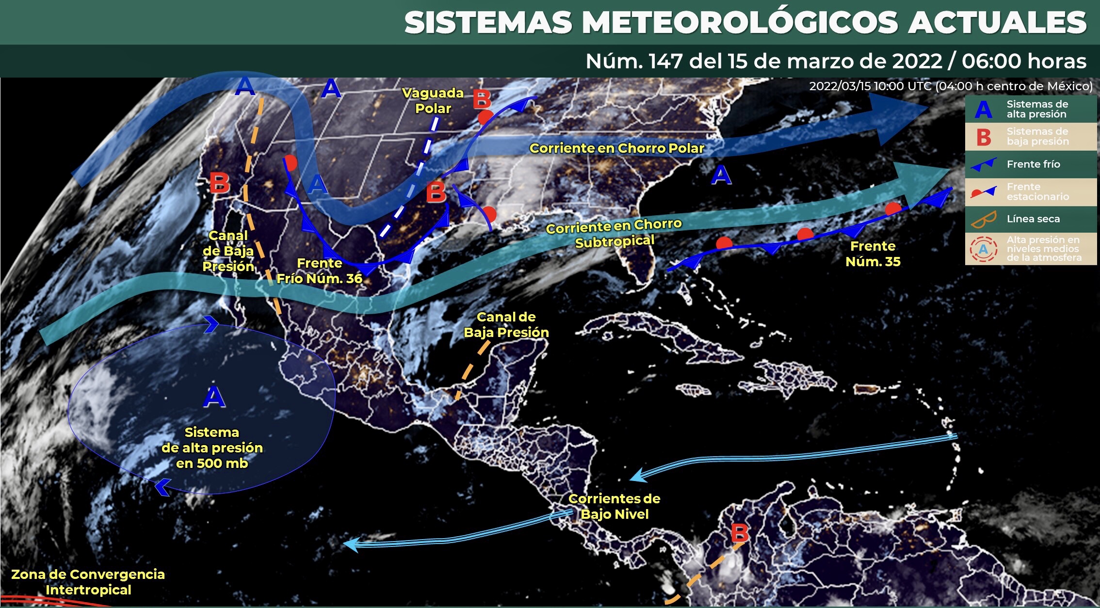 Para hoy, el frente frío Núm. 36 se extenderá desde el norte del Golfo de México y cruzará el sureste del país y el occidente de la Península de Yucatán, lo que ocasionará lluvias muy fuertes en zonas de Oaxaca y Tabasco, e intensas en Chiapas, acompañadas de actividad eléctrica y posibles granizadas, por lo que dichas lluvias podrían generar desbordamiento de ríos y arroyos, deslaves e inundaciones en zonas bajas de dichos estados, además de lluvias puntuales fuertes en Tlaxcala, Puebla, Veracruz, Campeche, Yucatán y Quintana Roo. La masa de aire frío asociada al frente, mantendrá ambiente frío a muy frío durante la mañana y noche en estados de la Mesa del Norte y la Mesa Central, con heladas al amanecer en sus zonas altas y temperaturas mínimas gélidas en sierras de Chihuahua y Durango. Asimismo, dicha masa de aire producirá rachas de viento de 60 a 70 km/h con tolvaneras en zonas del noreste y norte del territorio, y en su progresivo avance durante el día, originará viento de componente norte, con rachas de 50 a 60 km/h en el norte y centro del litoral del Golfo de México, rachas de 40 a 50 km/h en costas de Tabasco, norte y occidente de la Península de Yucatán, así como rachas de 60 a 70 km/h en el Istmo y Golfo de Tehuantepec. En contraste prevalecerá ambiente vespertino cálido a caluroso principalmente por la tarde, sobre el noreste, norte, noroeste, occidente, sur y sureste del país, incluida la Península de Yucatán, con temperaturas máximas muy calurosas en zonas de Michoacán y Guerrero.