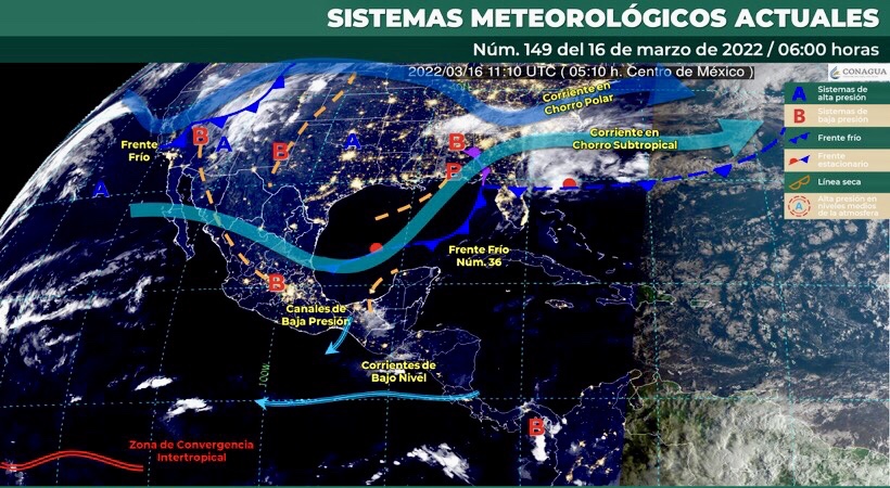 Durante este día, el frente frío Núm. 36 se desplazará sobre el sureste del país y la Península de Yucatán, ocasionando chubascos y lluvias puntuales fuertes las cuales se acompañarán de descargas eléctricas en zonas de dichas regiones. Mientras que, la masa de aire frío asociada al frente, tenderá a modificar sus características térmicas, sin embargo, mantendrá viento de componente norte en el Istmo y Golfo de Tehuantepec, y provocará fuertes ráfagas en el noreste de México. Por otro lado, un canal de baja presión sobre el interior del país en interacción con la corriente en chorro subtropical, ocasionarán lluvias y chubascos que se acompañarán de descargas eléctricas y posible caída de granizo en zonas del centro y occidente de México, así como, rachas de viento de fuertes a muy fuertes con probabilidad de tolvaneras en el norte del territorio nacional. Finalmente, continuará ambiente vespertino cálido a caluroso sobre la mayor parte del territorio nacional.