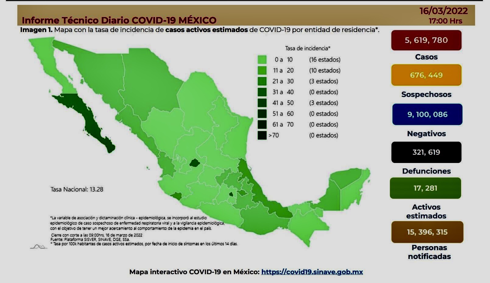 La Secretaría de Salud informó este miércoles que México suma 5 millones 619 mil 780 casos y 321 mil 619 muertes por COVID-19.