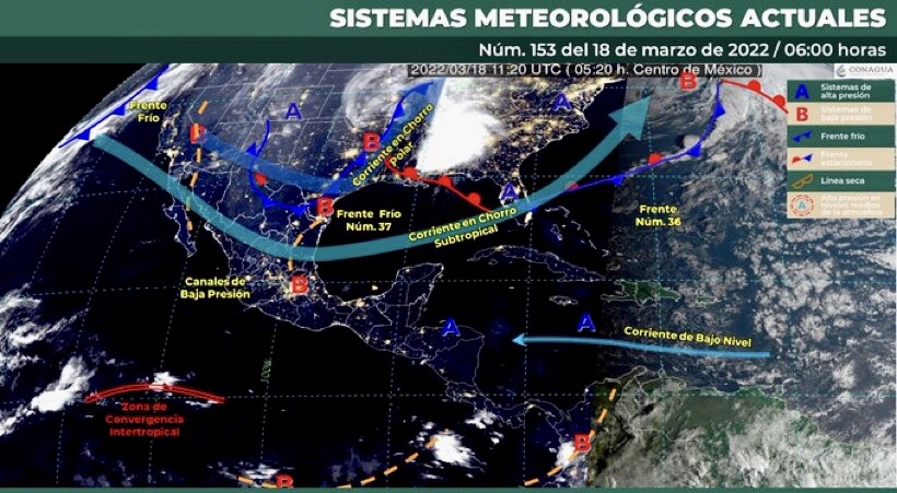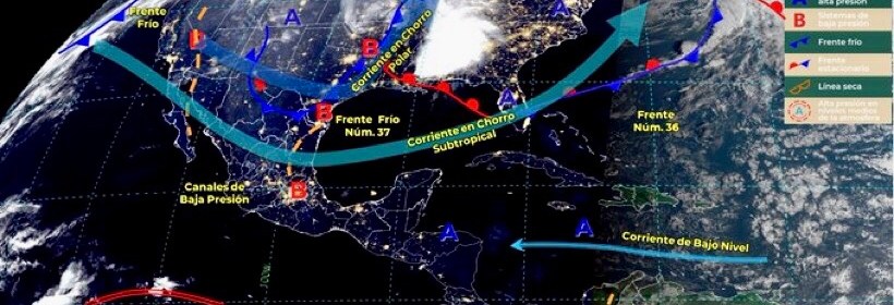 Durante este día, el frente frío Núm. 37 recorrerá el norte y noreste del territorio nacional, hasta el sur de Veracruz, en interacción con un canal de baja presión sobre el suroeste del Golfo de México, ocasionarán chubascos a lluvias puntuales fuertes en el noreste, oriente, centro y sureste del país, siendo puntualmente muy fuertes en Puebla, Veracruz y Oaxaca. La masa de aire frío asociada al frente y la corriente en chorro subtropical originarán descenso en la temperatura y posibles heladas matutinas en zonas altas de la Mesa del Norte y la Mesa Central, así como rachas de viento fuertes y tolvaneras en el norte y noreste de México. Por otra parte, un canal de baja presión sobre el interior de la República Mexicana generará lluvias en el centro y sur del país. Finalmente, prevalecerá ambiente vespertino cálido a caluroso, cielo despejado y sin lluvia en el noroeste, norte y occidente de México.