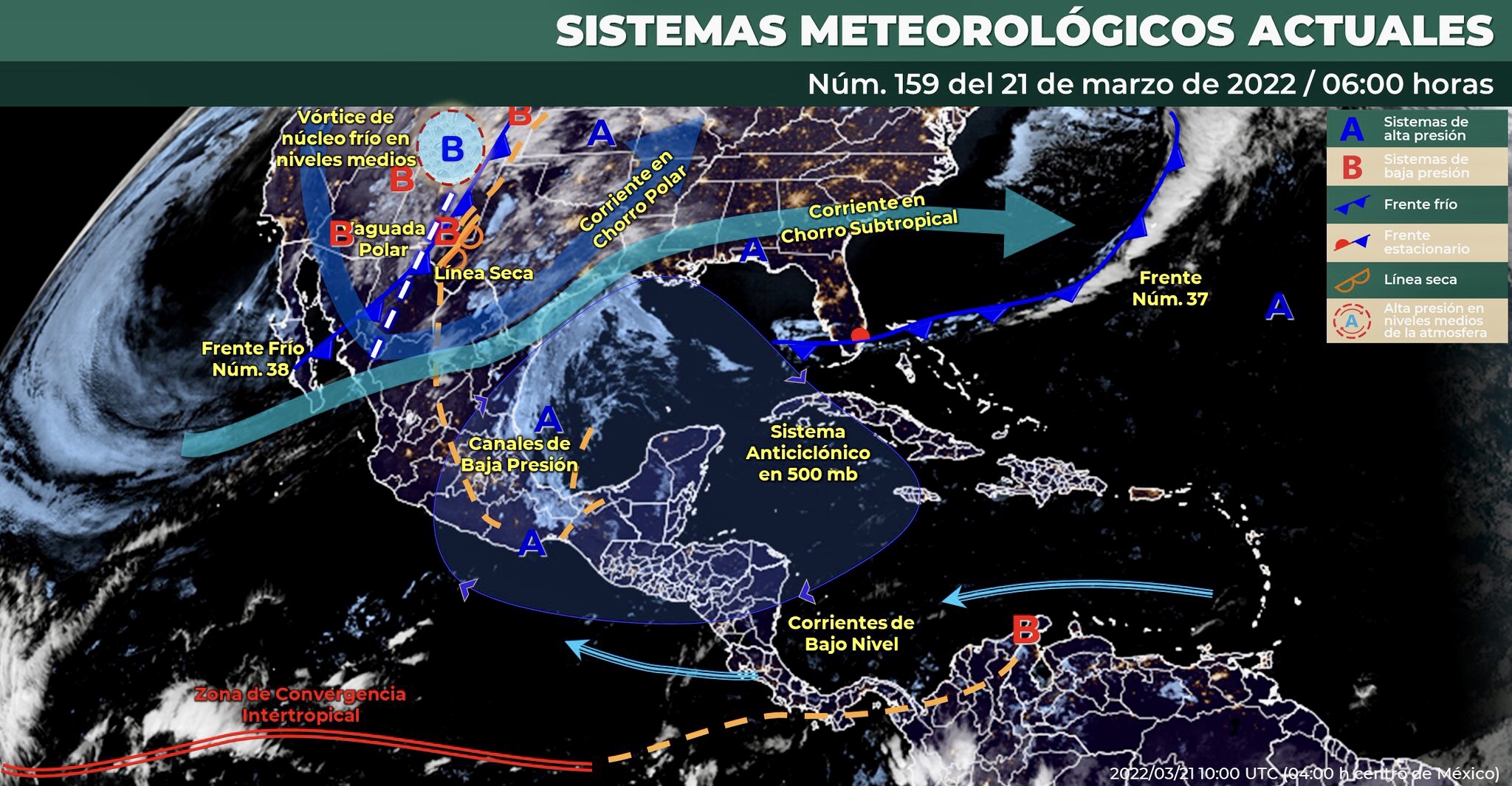 Para hoy, el frente frío Núm. 38 y una vaguada polar, en interacción con una línea seca y con las corrientes en chorro subtropical y polar, producirán rachas de viento muy fuertes a intensas con tolvaneras en el norte y noreste del territorio nacional, y rachas de viento fuertes en zonas del noroeste y occidente de México, así como lluvias y chubascos en el noroeste, norte y noreste del país, acompañados de descargas eléctricas en zonas de Sonora, Chihuahua, Coahuila, Nuevo León y Tamaulipas, con ambiente matutino muy frío a gélido y posible caída de nieve o aguanieve en las sierras de Sonora y Chihuahua. Canales de baja presión en el sur del Golfo de México y el Istmo de Tehuantepec, generarán rachas de viento fuertes en el sureste de México. El ingreso de humedad del Océano Pacífico, Golfo de México y Mar Caribe, originará lluvias y chubascos acompañados de descargas eléctricas en zonas del oriente y sureste mexicano y lluvias aisladas en zonas del centro del país y estados de la Península de Yucatán. Un anticiclón en niveles medios de la atmósfera y un sistema de alta presión en superficie mantendrán ambiente vespertino cálido a caluroso en gran parte de México, con temperaturas máximas muy calurosas en zonas del noreste, occidente y sur del territorio, además de viento de componente sur con rachas fuertes a muy fuertes en el norte, centro y sur del litoral del Golfo de México, norte y occidente de la Península de Yucatán.
