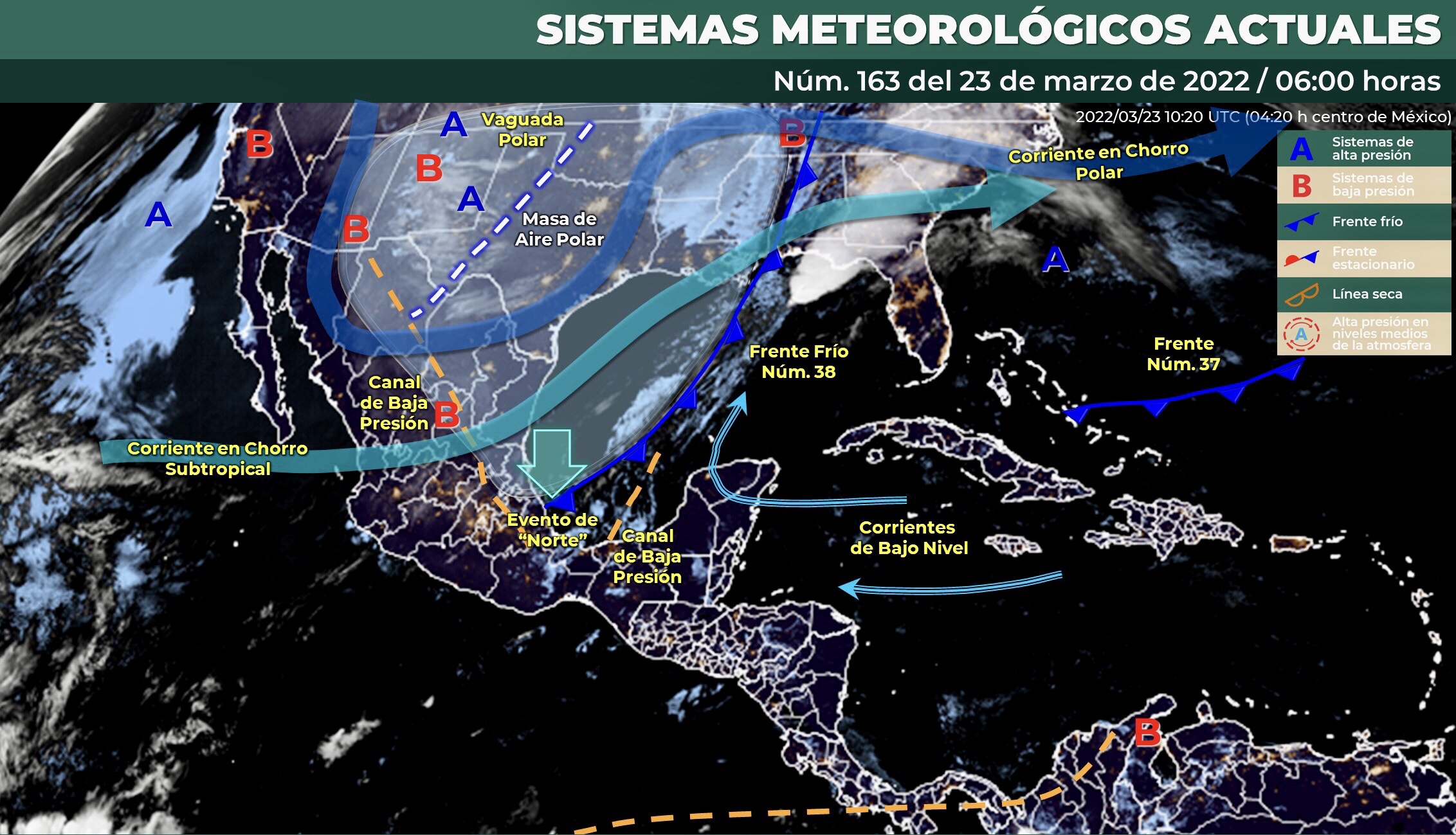 Para hoy, el frente frío Núm. 38 recorrerá el sureste mexicano e interaccionará con un canal de baja presión sobre la Península de Yucatán, lo que generará chubascos en Yucatán y lluvias fuertes en Veracruz, Tabasco y Campeche, así como lluvias puntuales muy fuertes en Chiapas, acompañadas de descargas eléctricas y posible caída de granizo. La masa de aire frío asociada al frente producirá ambiente matutino frío a muy frío, en algunos estados del norte y noreste de México, densos bancos de niebla en el oriente y sureste del país, además de evento de “Norte”con rachas de 60 a 80 km/h en el centro y sur del litoral de Veracruz e Istmo y Golfo de Tehuantepec, y con rachas de 50 a 60 km/h en el litoral de Tamaulipas y Tabasco. Una vaguada polar y la corriente en chorro polar generarán probabilidad para la caída de nieve o aguanieve en el noreste de Chihuahua y norte de Coahuila. Un centro de baja presión sobre el norte de Zacatecas y San Luis Potosí y otro canal de baja presión extendido desde el centro hasta el norte del territorio, ocasionarán rachas fuertes de viento con tolvaneras en algunas zonas de la Mesa del Norte y vientos fuertes sobre algunos estados del centro de México.