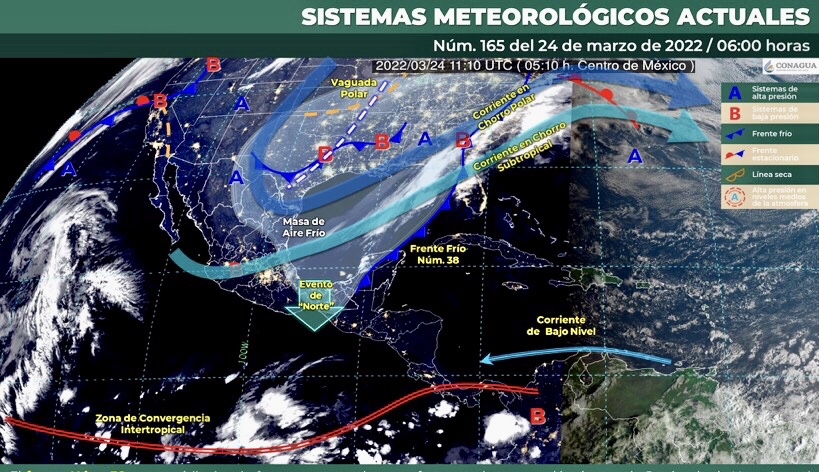 Durante este día, el frente Núm. 38 recorrerá la Península de Yucatán y el sureste de México, generando lluvias de fuertes a puntuales muy fuertes, las cuales se acompañarán de descargas eléctricas en dichas regiones. Al final del día, se pronostica que dicho frente se extienda sobre el Mar Caribe. Asimismo, la masa de aire frío asociada al frente, mantendrá evento de “Norte” intenso en el Istmo y Golfo de Tehuantepec, así como fuerte en costas de Tabasco, Campeche, Yucatán y Quintana Roo (norte); además, persistirá ambiente de frío a muy frío con heladas en zonas altas del norte y centro del país, percibiéndose ambiente gélido en zonas altas de Chihuahua y Durango, así como, bancos de niebla en sierras del oriente y sureste de México. Por otro lado, continuará ambiente estable y caluroso en zonas del noroeste, norte, occidente y sur del país.