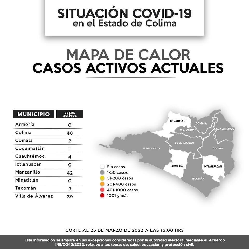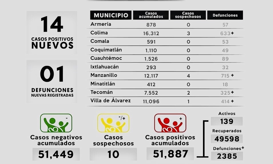 Colima alcanza 51 mil 887 positivos y 2 mil 385 decesos acumulados por esta causa.