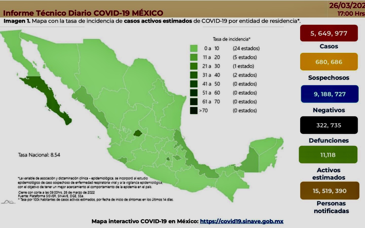 La Secretaría de Salud informó este sábado que México suma un total de 5 millones 649 mil 977 casos positivos confirmados acumulados y 322 mil 735 muertes por COVID-19.