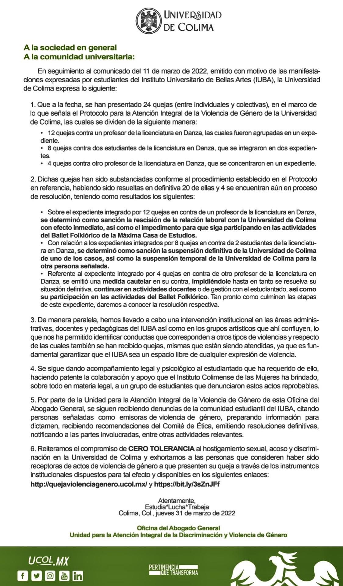 La Universidad de Colima informó mediante un comunicado que, derivado de las manifestaciones expresadas por estudiantes del Instituto Universitario de Bellas Artes (IUBA), de las 24 quejas presentadas por hostigamiento sexual, acoso y discriminación, se han resuelto 20 y 4 están en proceso de resolución.