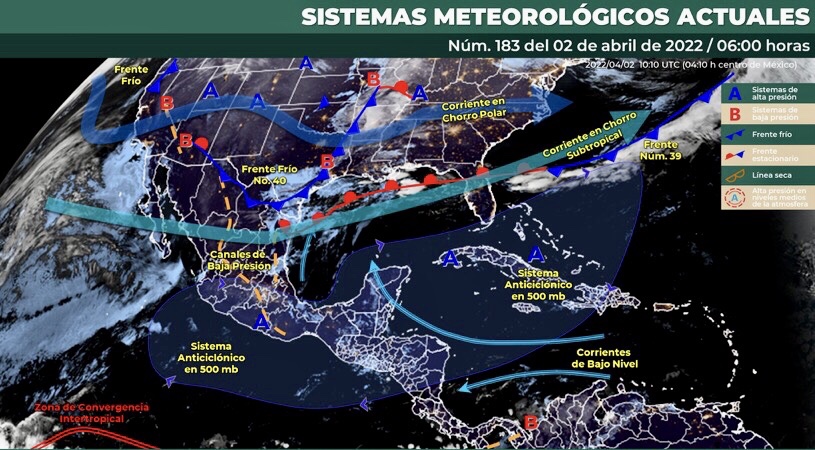 Para hoy, el frente frío Núm. 40 se localiza en el norte del país, en interacción con la corriente en chorro subtropical y un canal de baja presión a lo largo de la Sierra Madre Oriental, ocasionarán lluvias aisladas y chubascos con descargas eléctricas en el noreste y oriente del territorio nacional, con posible caída de granizo, principalmente en Coahuila, Nuevo León, Tamaulipas y San Luis Potosí, además de fuertes rachas de viento sobre entidades de la Mesa del Norte. El ingreso de humedad del Océano Pacífico y Mar Caribe, originarán lluvias aisladas y chubascos en el sureste mexicano y la Península de Yucatán. Se mantendrá evento de “Surada” con rachas de hasta 60 km/h en el Istmo de Tehuantepec y la Península de Yucatán. La onda de calor mantendrá en horas de la tarde ambiente caluroso a muy caluroso en gran parte del territorio nacional. Sin embargo, durante la madrugada y al amanecer, se mantendrá ambiente frío en las sierras de la Mesa del Norte y la Mesa Central.