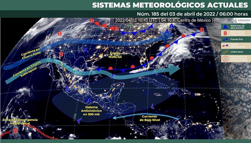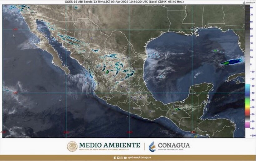 Este día, la onda de calor mantendrá ambiente vespertino caluroso a muy caluroso, sin embargo, durante la madrugada y al amanecer, continuará ambiente frío en zonas serranas de la Mesa del Norte y la Mesa Central. Así mismo, un canal de baja presión se extenderá sobre el norte del país e interaccionará con la corriente en chorro subtropical, generando lluvias con chubascos en dicha región, además de rachas de viento fuertes sobre entidades de la Mesa del Norte. Por otra parte, el frente Núm. 40 se extenderá como estacionario sobre el noreste de México y se prevé que hacia la tarde, adquiera características cálidas, sin generar efectos para el país. A su vez, el ingreso de humedad del Océano Pacífico, Golfo de México y Mar Caribe, propiciará lluvias y chubascos aislados en el oriente y sureste del territorio nacional.
