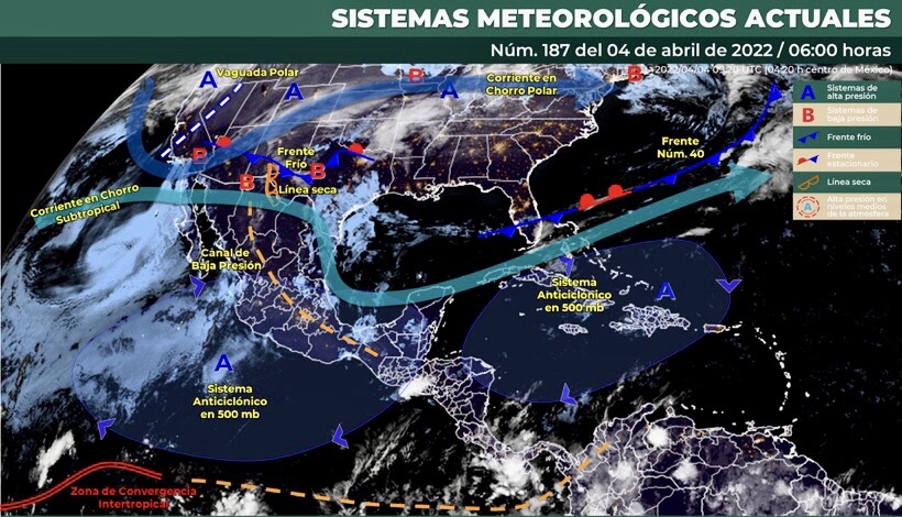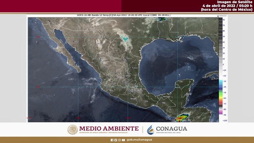 Para hoy, la onda de calor mantendrá el ambiente vespertino caluroso a muy caluroso y escasa probabilidad de lluvia sobre la mayor parte del territorio nacional, sin embargo, al amanecer continuará ambiente frío en zonas serranas de la Mesa del Norte y la Mesa Central. Por otro lado, una vaguada polar que recorrerá la zona fronteriza del norte de México, en interacción con la corriente en chorro subtropical generarán rachas fuertes de viento con posibles tolvaneras o torbellinos en los estados del norte y noreste del país. Por otro lado, un nuevo sistema frontal que se aproximará a la frontera norte de México, interaccionará con una línea seca sobre el norte de Coahuila y un canal de baja presión en el interior de la República Mexicana y originarán chubascos con descargas eléctricas en Coahuila, Nuevo León y Tamaulipas. Finalmente, el ingreso de humedad del Océano Pacífico, Golfo de México y Mar Caribe, propiciará lluvias y chubascos aislados en el sureste del país.