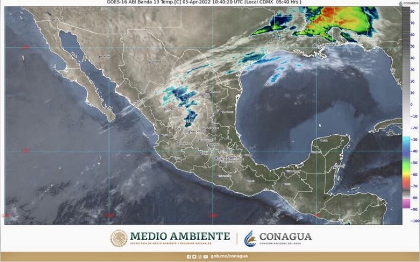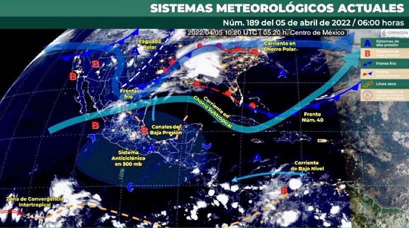 Este día, la onda de calor mantendrá ambiente vespertino caluroso a muy caluroso y escasa probabilidad de lluvia sobre el occidente, centro, oriente y sureste del territorio nacional, así como ambiente frío al amanecer en las sierras de la Mesa del Norte y la Mesa Central. Por otra parte, una línea seca se extenderá sobre el noreste del país y, en interacción con la corriente en chorro subtropical, ocasionará rachas de viento fuertes en el norte y noreste de México, además de lluvias aisladas en Coahuila, Nuevo León y Tamaulipas. Así mismo, el ingreso de humedad del Océano Pacífico, propiciará lluvias y chubascos aislados en Oaxaca y Chiapas. También, se prevé viento de componente sur (surada) en las costas de la Península de Yucatán y el Istmo de Tehuantepec. Finalmente, un frente frío al norte de Coahuila sin afectar a la República Mexicana.